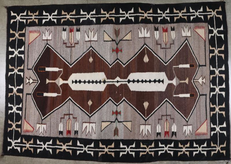 with large crystal & feather design. In brown, white & black with X's in border. Measure 70" by 50". In overall fair to good condition with minor staining.