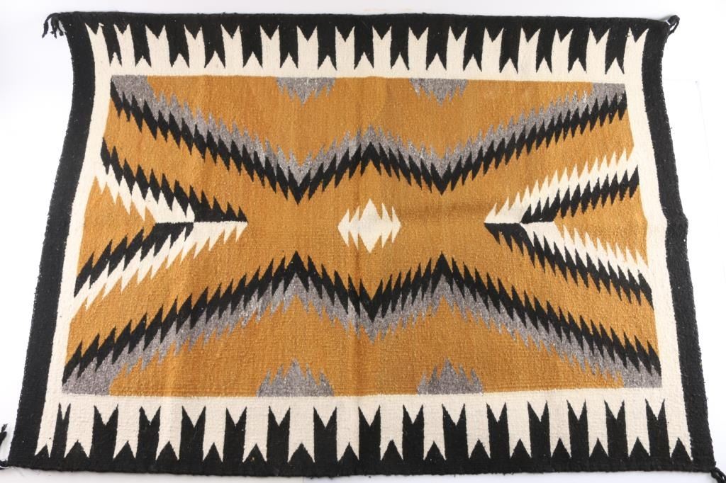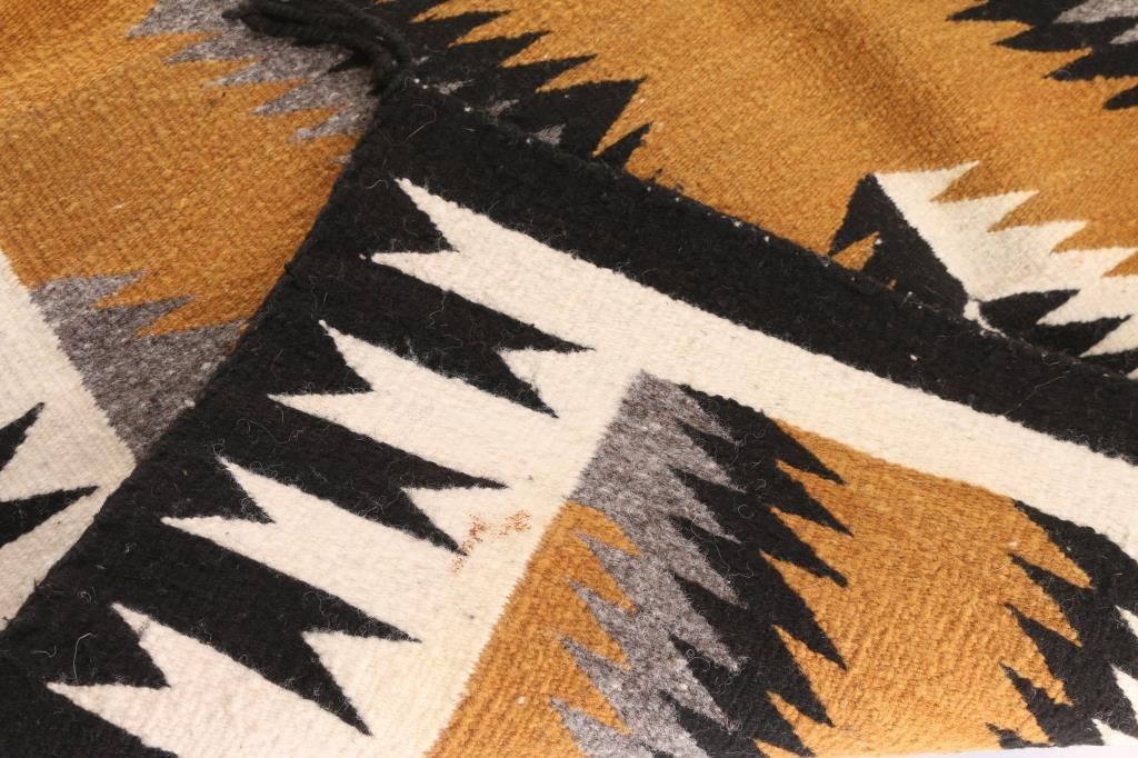 Measures 48 x 35". Has cream, black, grey design on deep gold background with cream and black design toward edges. In good condition.