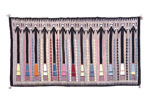 Navajo Yei Rug. 11' 4" x 5' 2". Lukachukai weaving on hand carded grayish brown field. All Native handspun wools. c. 1930s. Excellent condition. RARE large rug! (est $5,500-7,500)