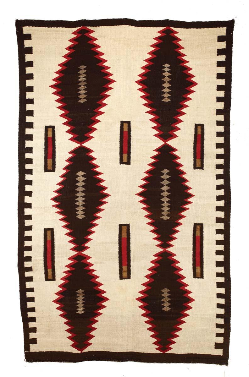 89 x 54 Connecting serrated diamonds and floating rectangular boxes in red, black, tan, grey and white with railroad track side border. Fine condition, c 1940