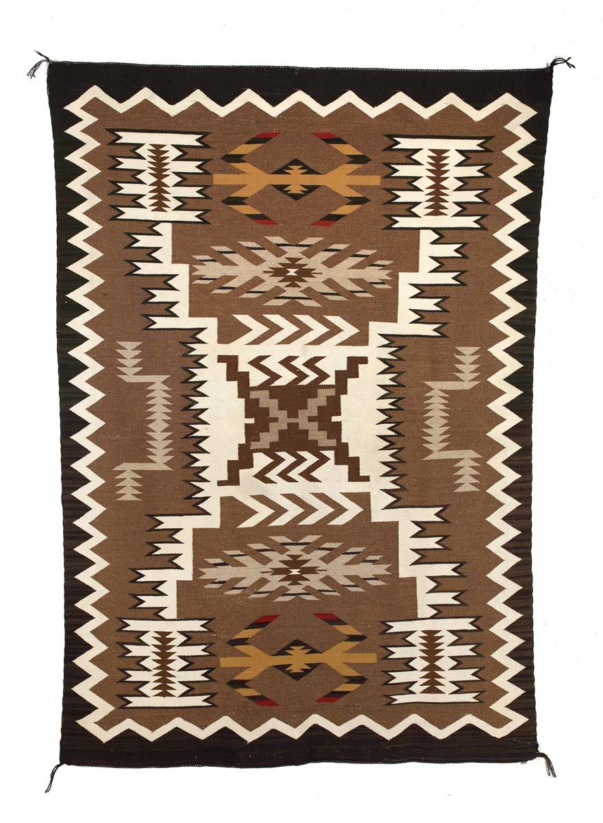 67 x 46 Classic storm pattern in brown, grey, red, gold and white with sawtooth outside border. Fine condition, c 1950