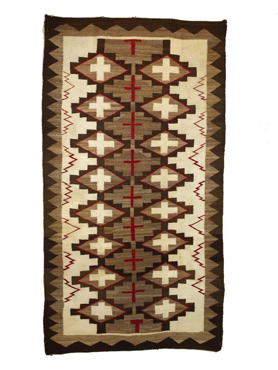 90 x 49 Overall designs of crosses, diamonds and serrated elements in brown, grey, red, black on white field with sawtooth border. Good condition with minor edge wear, c 1940