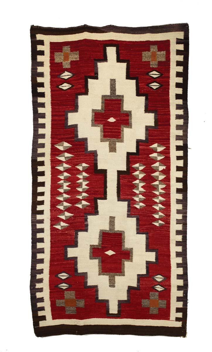 81 x 39 Connecting stepped crosses and floating geometric devices in black, white, grey and brown on red field. Stepped outside border. Fine condition, c 1940