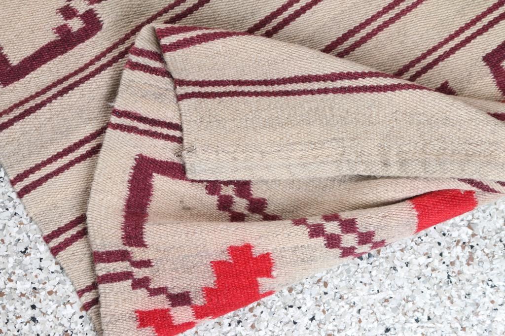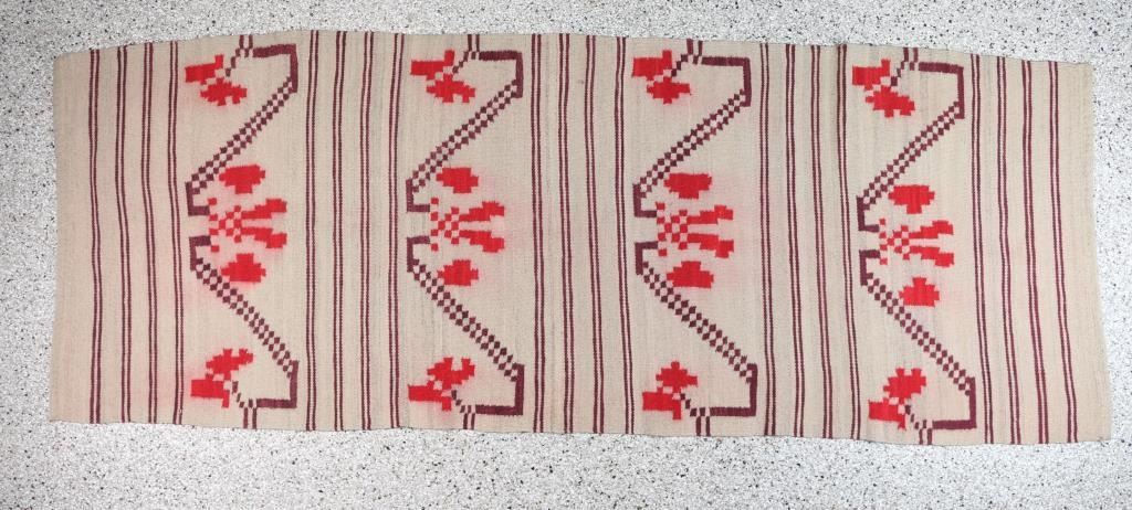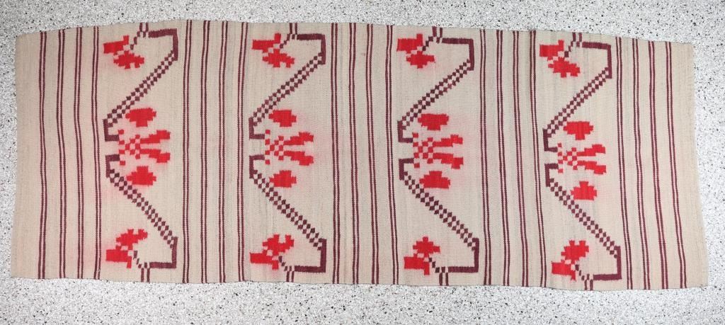 In plum and red on natural background. Some bleeding of red colors, otherwise good condition. Measures 83 1/2" x 31".