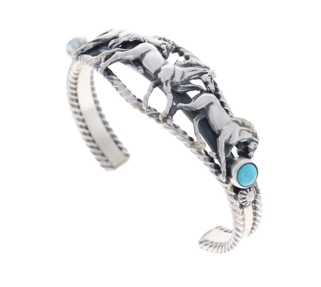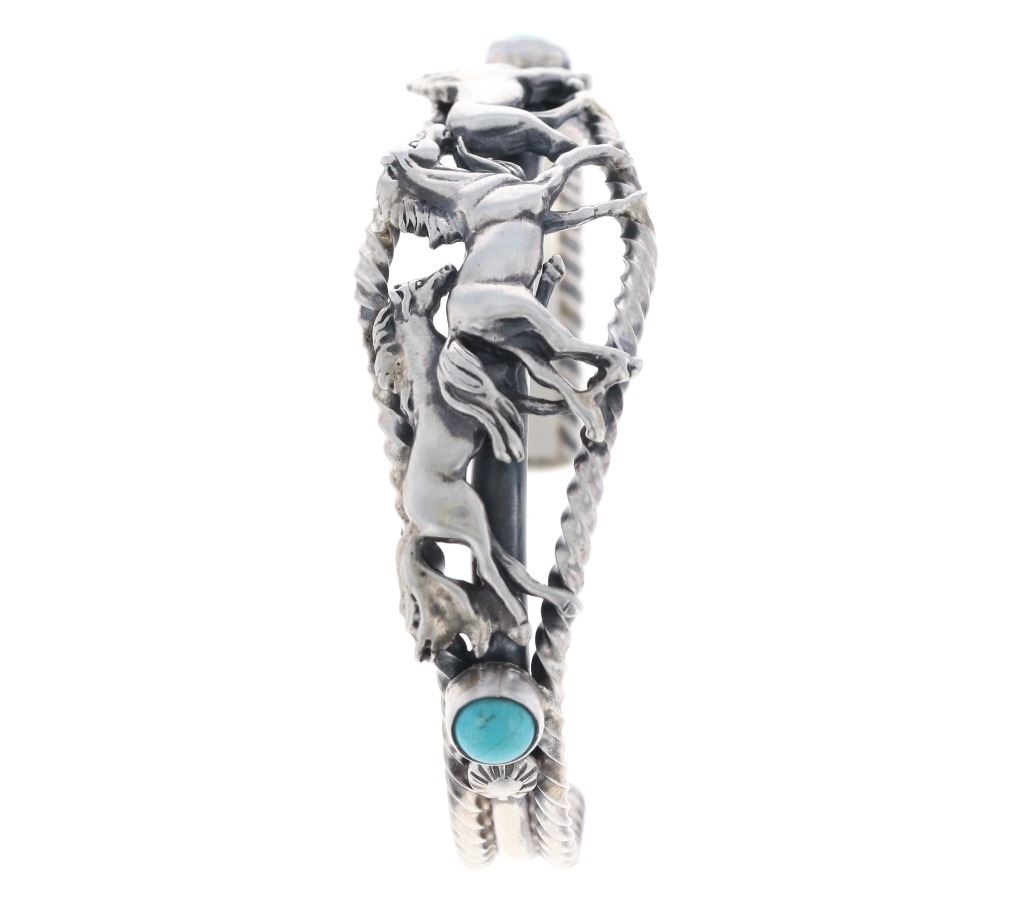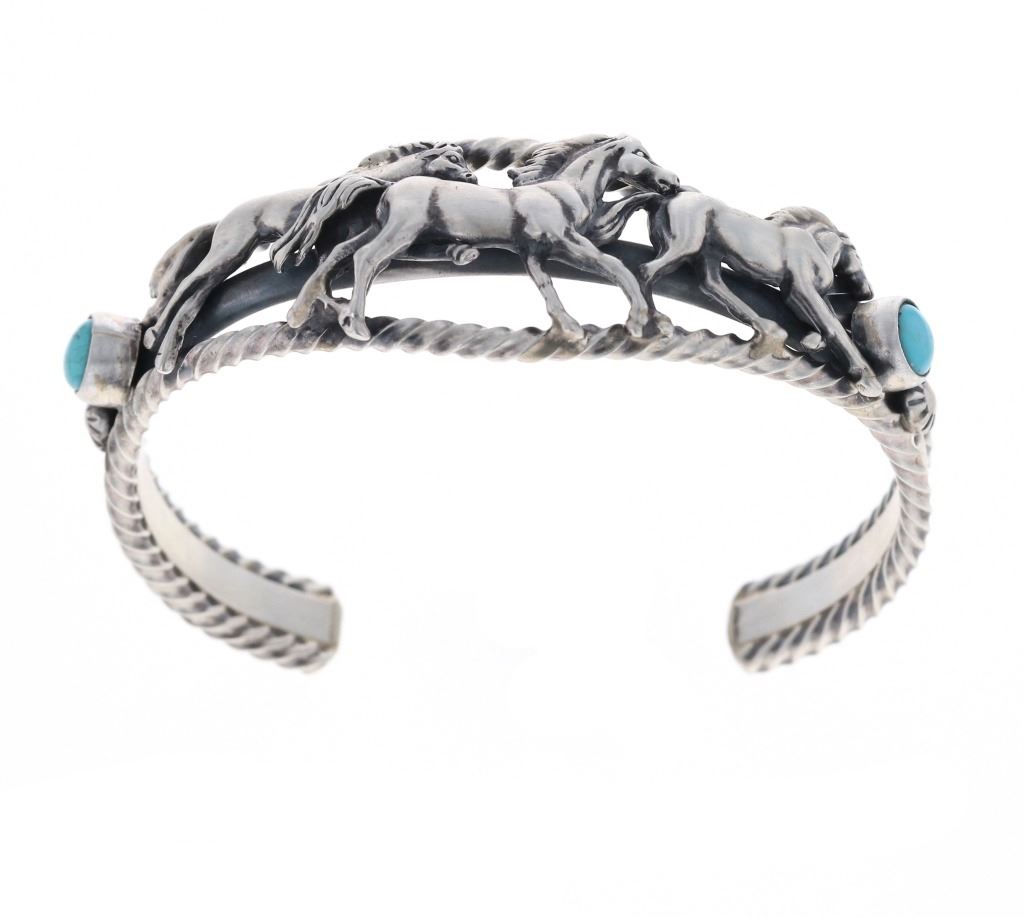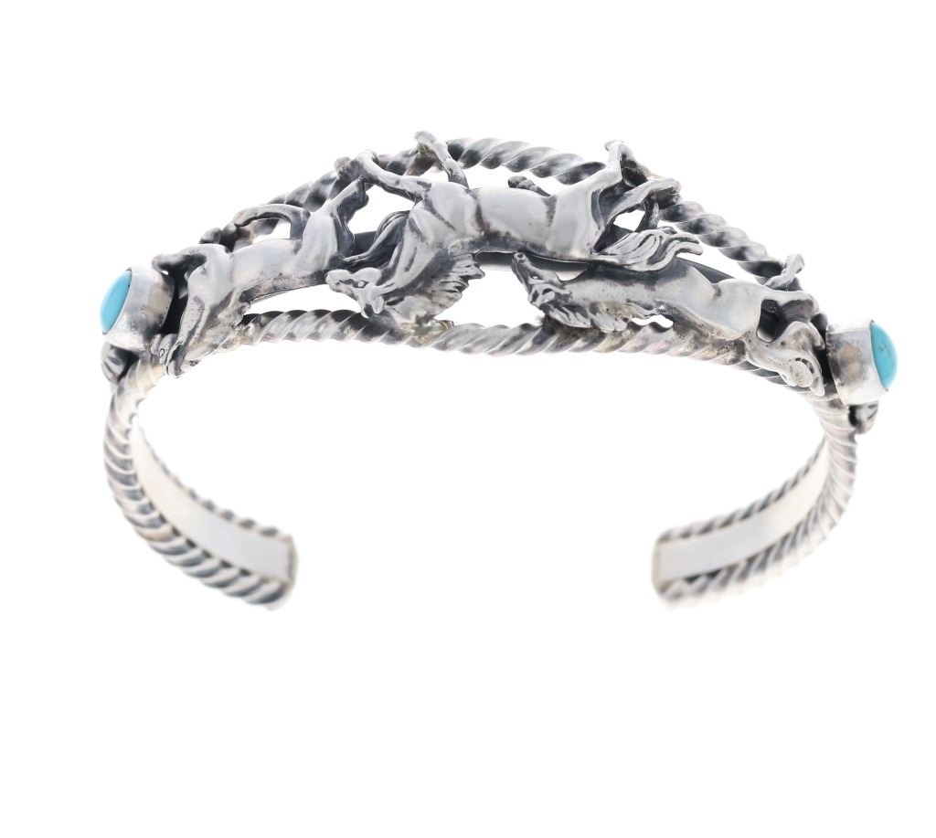 This is an original highly figured running horses bracelet set with turquoise from renowned artist, Navajo Running Bear. The bracelet shows three dimensionally Horse effigy sterling silver figures running along the front on top of the twisted rope sterling silver cuff which is set with two polished cabochons of turquoise from the Kingman Turquoise mine. The bracelet has a heavy sterling silver construction and is truly an iconic piece with other examples of running horse bracelets from Running Bear being at $1,800 (in this exact form). Measures overall 6.25"L inside wrist circumference which includes the 1.25"W opening. Total weight of 32.5 grams.