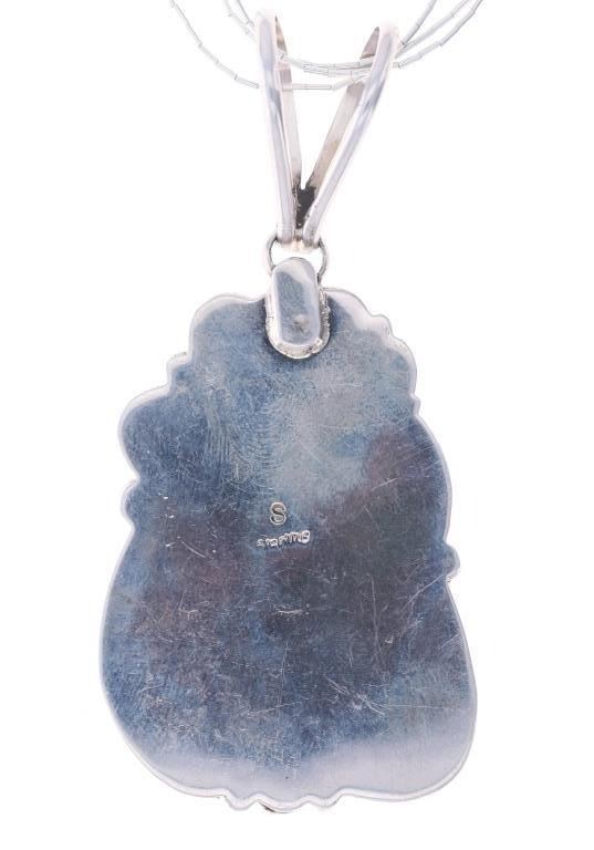 Featured in this lot is this sterling silver turquoise necklace from Navajo artist Sylvia Chee. The necklace features a wonderfully and professionally crafted sterling silver and turquoise construction. The necklace shows a central pendant with a triple strand necklace chain with three Morenci turquoise cabochon set into the face of the pendant. The pendant is marked 'S' and 'Sterling' on the back of the pendant. The condition of this necklace shows a bright sheen to the sterling silver and a good darker blue coloration to the turquoise and shows no obvious signs of damage. The measurements of this necklace from clasp to clasp is 21" and the pendant measures 3" x 1 1/2". The collective weight of this necklace is 27.7g.