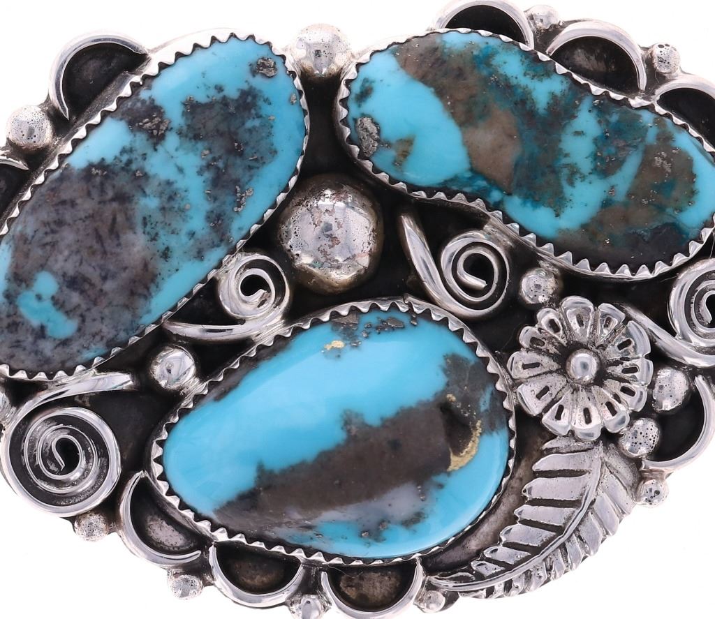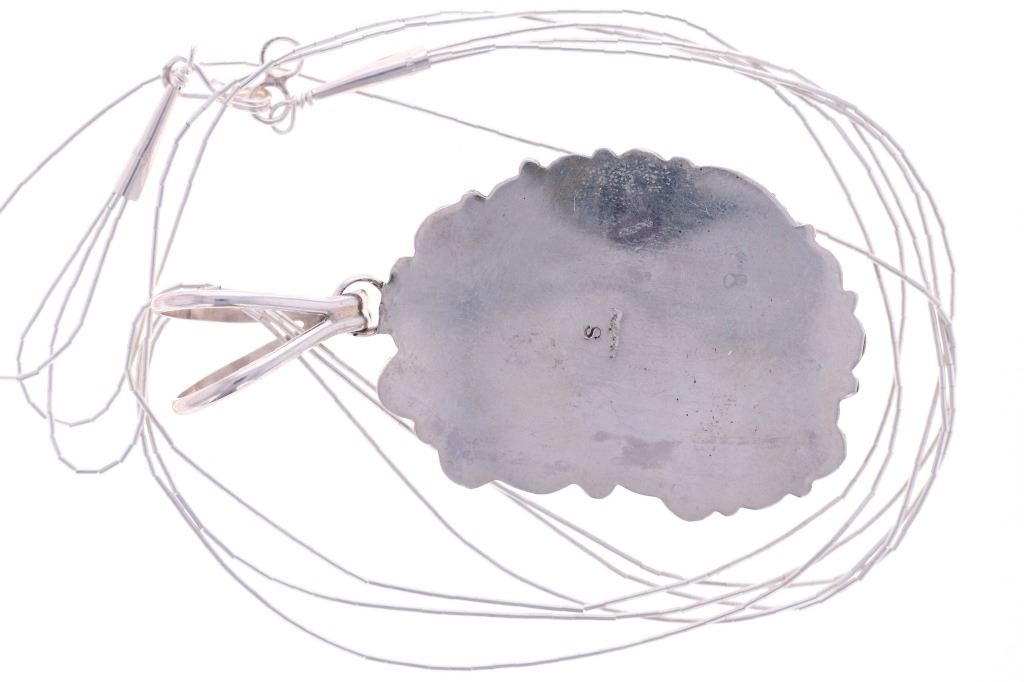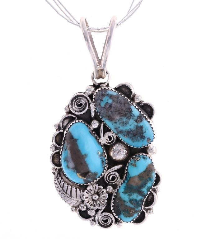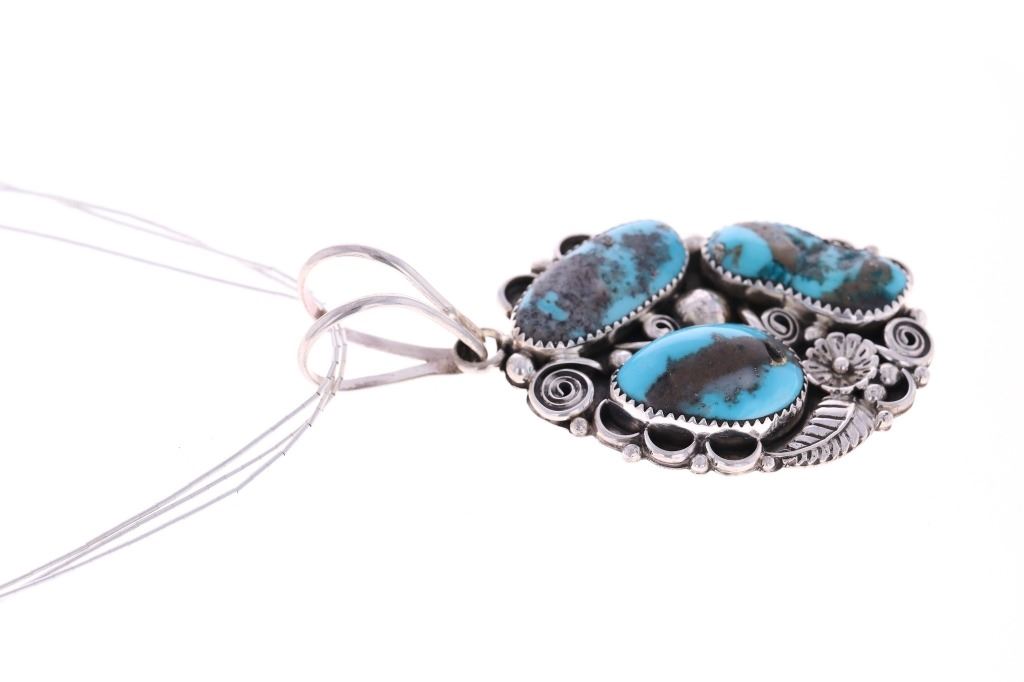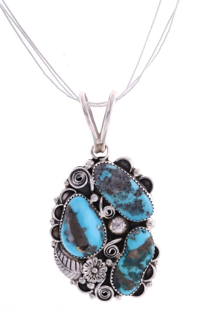 Featured in this lot is this sterling silver and turquoise necklace from Navajo artist Sylvia Chee. The necklace is wonderfully and professionally crafted sterling silver and turquoise construction. The necklace features a a cluster design of a total of three Paiute turquoise cabochon set into a beautifully tooled pendant face. The necklace is marked on the back of the pendant as follows: S - sterling. The condition of this Navajo necklace is good with no obvious signs of damage and shows good overall condition. The measurements of this necklace from clasp to clasp is 20 3/4" and the pendant measures 3" x 1 1/2" x1 5/8". The collective weight of this necklace is 29.7g.