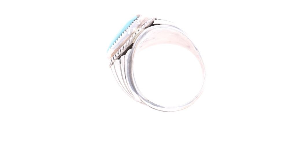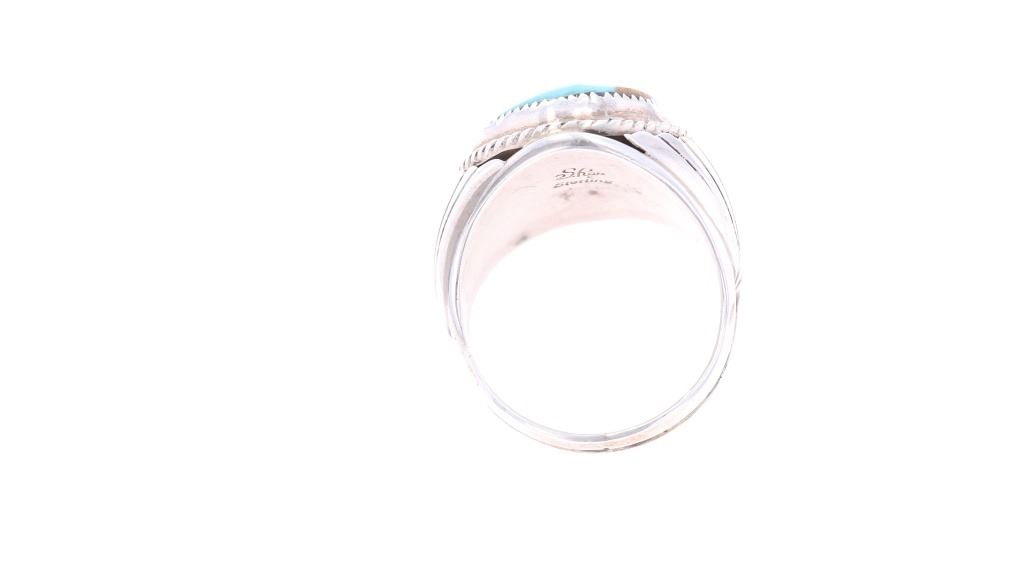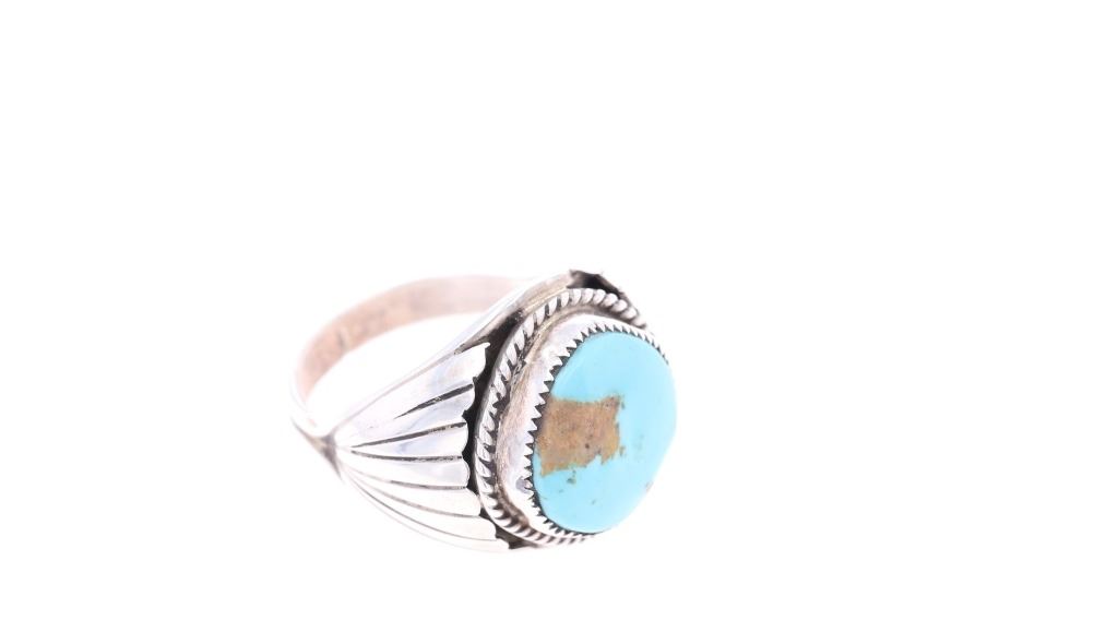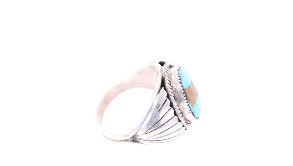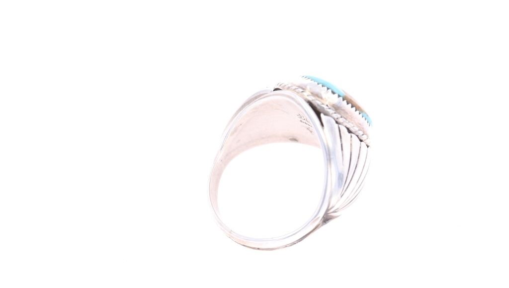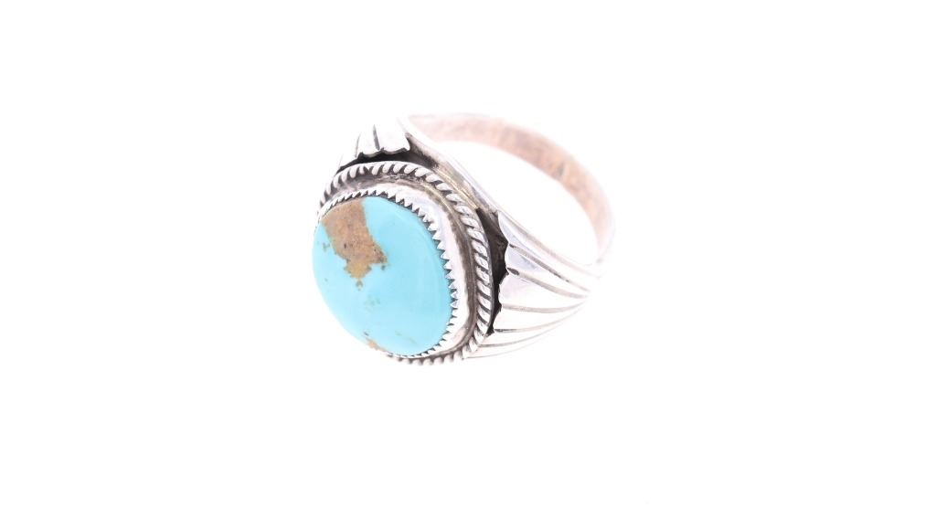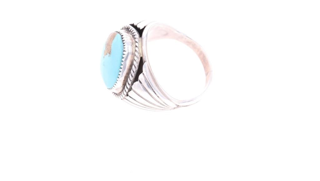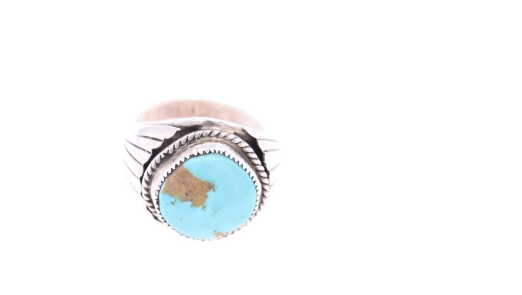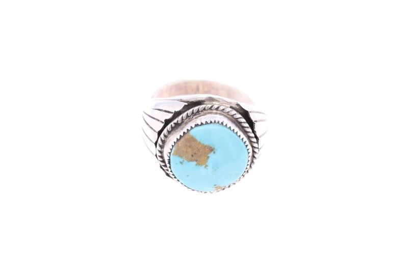 For your consideration is this beautiful sterling and Blue Gem turquoise ring done by Navajo silversmith Silver Ray. The ring features a large cabochon of Blue Gem turquoise set into the top of the ring with a rope style border going around the turquoise. The interior of the ring is marked reading, "S. Ray Sterling". The ring shows good condition overall. The ring is fitted for a US size 14 and measures 1" L x 1 1/8" W x 1 1/4" H. It has a total weight of 13.4 grams.