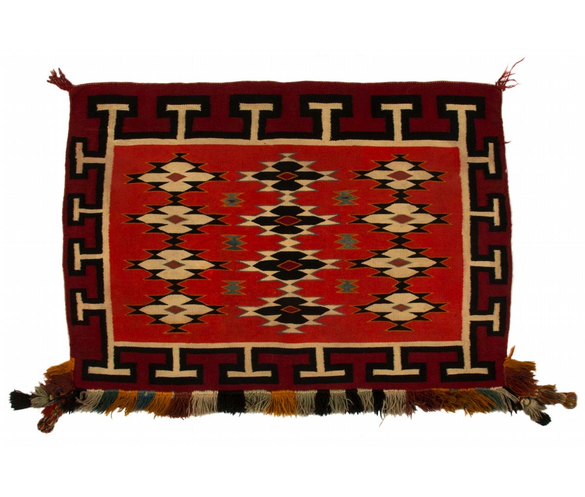 Navajo Saddle Blanket. 3'2" x 2'4". A tapestry quality Germantown single Sunday saddle blanket with original fringe and pompom tassels. Woven wider than long like the old classic blankets. This very finely woven textile will fit right into any good saddle blanket collection. Circa 1885.