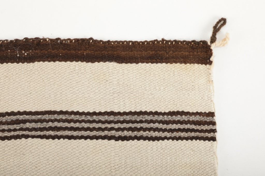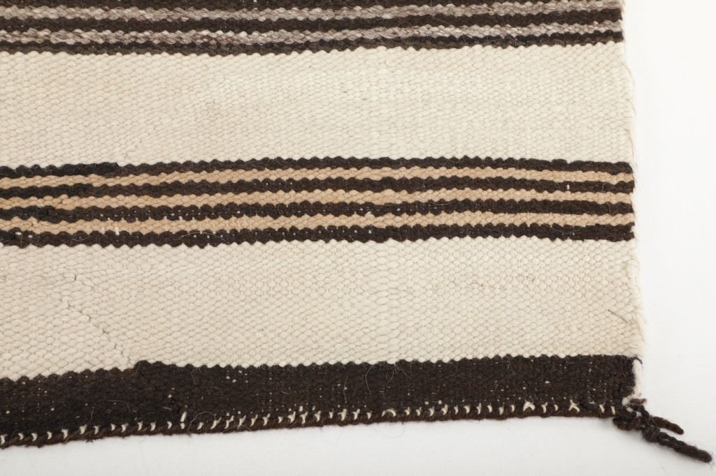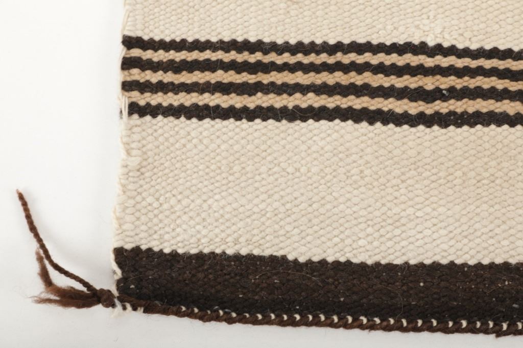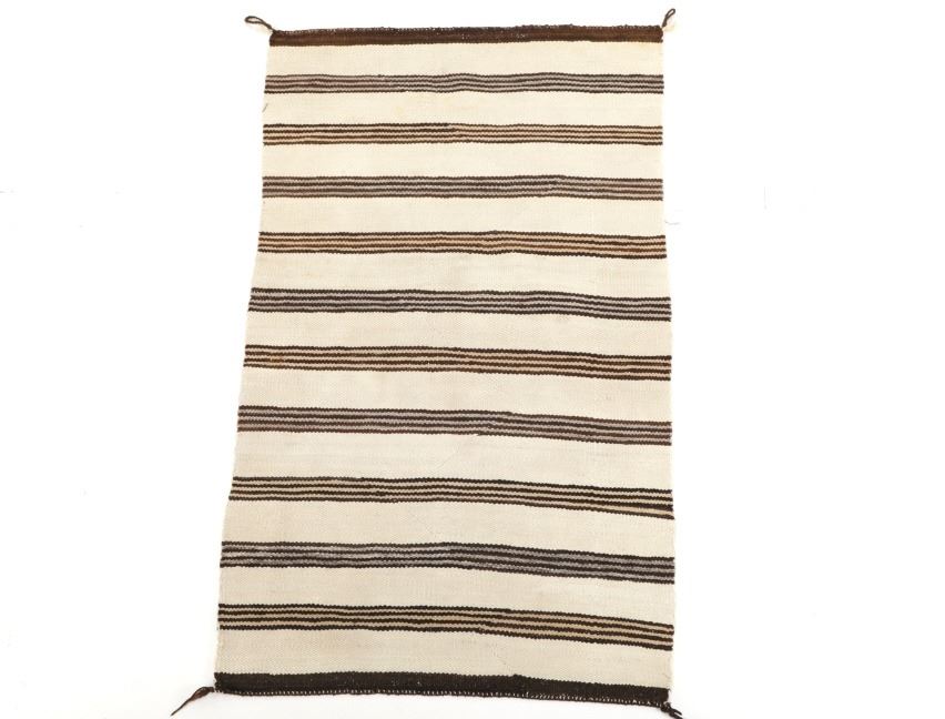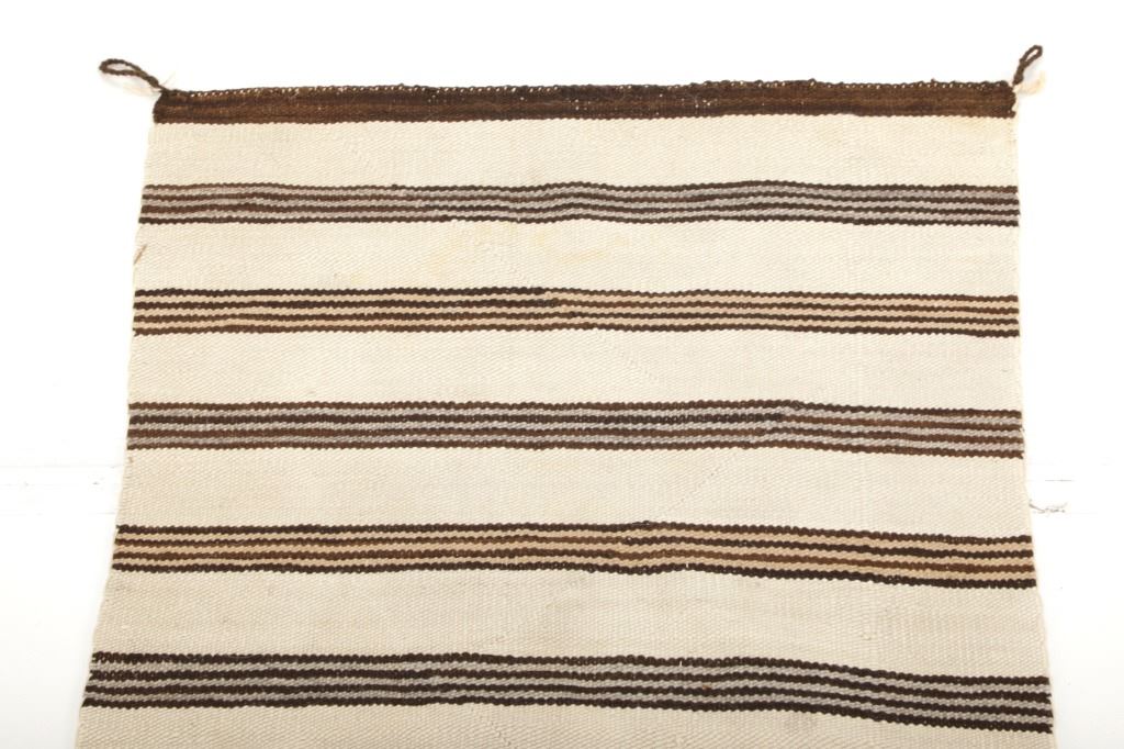 Featured in this lot is this Navajo Saddle Blanket hand woven rug circa 1940's. The rug features a wonderfully and professionally crafted wool construction that features a beautifully decorated with banded design and features a coloration of dark brown, light brown all set to an off white field. Navajo weavers have been producing numerous examples of Saddle Blankets from around 1880 to the present. These types of Blankets have also been used as Rugs for many years. Single Saddle Blankets are usually about thirty inches square. Double Saddle Blankets are meant to be folded in half, and are about thirty by sixty inches. A good portion of the Saddle Blankets were woven using a twill weave because it is stronger and thicker. Good Navajo Saddle Blankets used as a saddle blanket last in excess of 30 years. The condition of this Navajo Saddle Blanket is good with no obvious signs of damage and shows good overall condition. The measurements of this rug are 56 1/2" x 33 1/2". Provenance: From the renowned Sundog Fine Art Bozeman, Montana collection and collected by Bruce VanLandingham. Bruce VanLandingham was a pillar in the American Indian collecting community and a respected expert. Along with being an avid collector, Bruce also was the sole owner of Sundog Fine Art Gallery in Bozeman, which was both part museum and gallery.