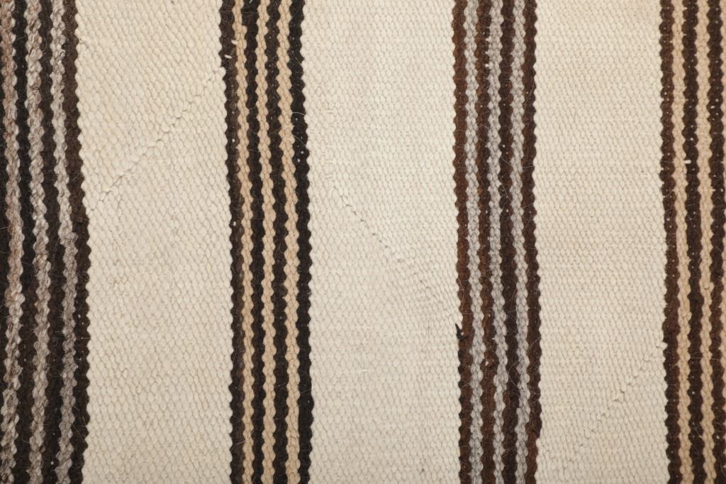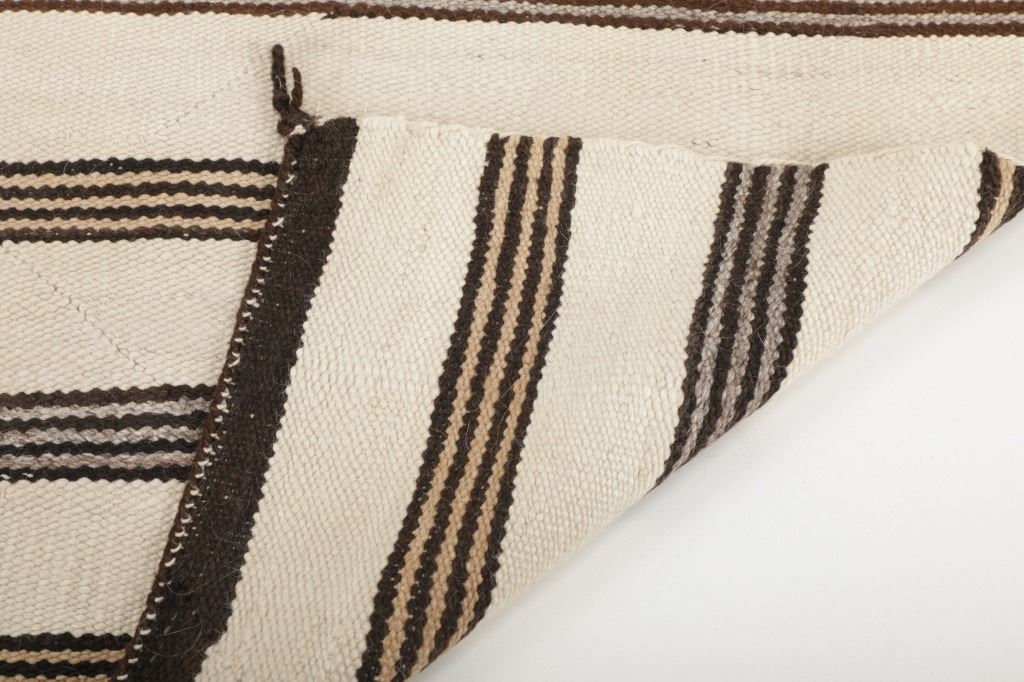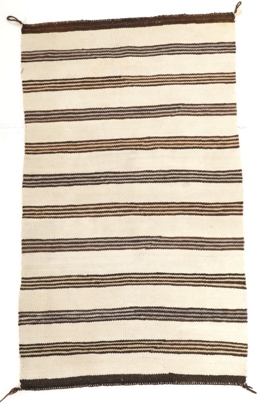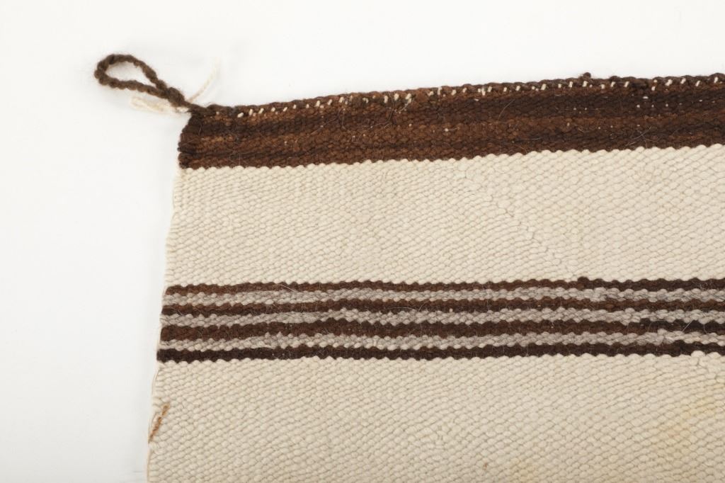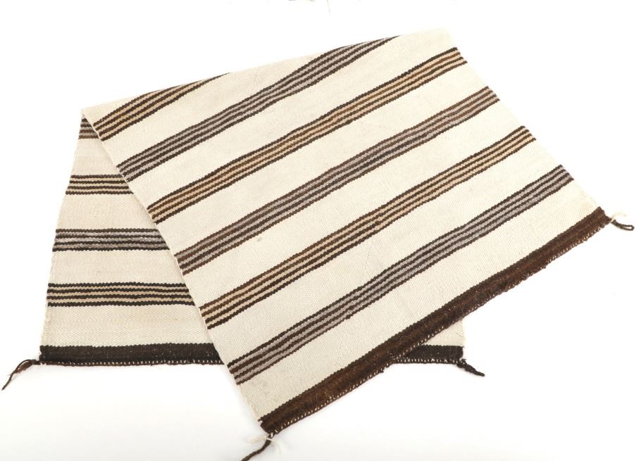 Featured in this lot is this Navajo Saddle Blanket hand woven rug circa 1940's. The rug features a wonderfully and professionally crafted wool construction that features a beautifully decorated with banded design and features a coloration of dark brown, light brown all set to an off white field. Navajo weavers have been producing numerous examples of Saddle Blankets from around 1880 to the present. These types of Blankets have also been used as Rugs for many years. Single Saddle Blankets are usually about thirty inches square. Double Saddle Blankets are meant to be folded in half, and are about thirty by sixty inches. A good portion of the Saddle Blankets were woven using a twill weave because it is stronger and thicker. Good Navajo Saddle Blankets used as a saddle blanket last in excess of 30 years. The condition of this Navajo Saddle Blanket is good with no obvious signs of damage and shows good overall condition. The measurements of this rug are 56 1/2" x 33 1/2". Provenance: From the renowned Sundog Fine Art Bozeman, Montana collection and collected by Bruce VanLandingham. Bruce VanLandingham was a pillar in the American Indian collecting community and a respected expert. Along with being an avid collector, Bruce also was the sole owner of Sundog Fine Art Gallery in Bozeman, which was both part museum and gallery.