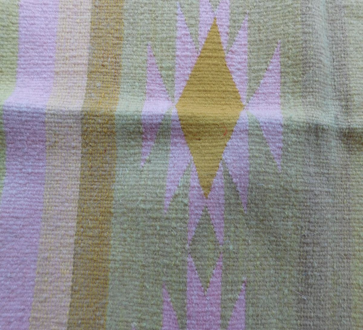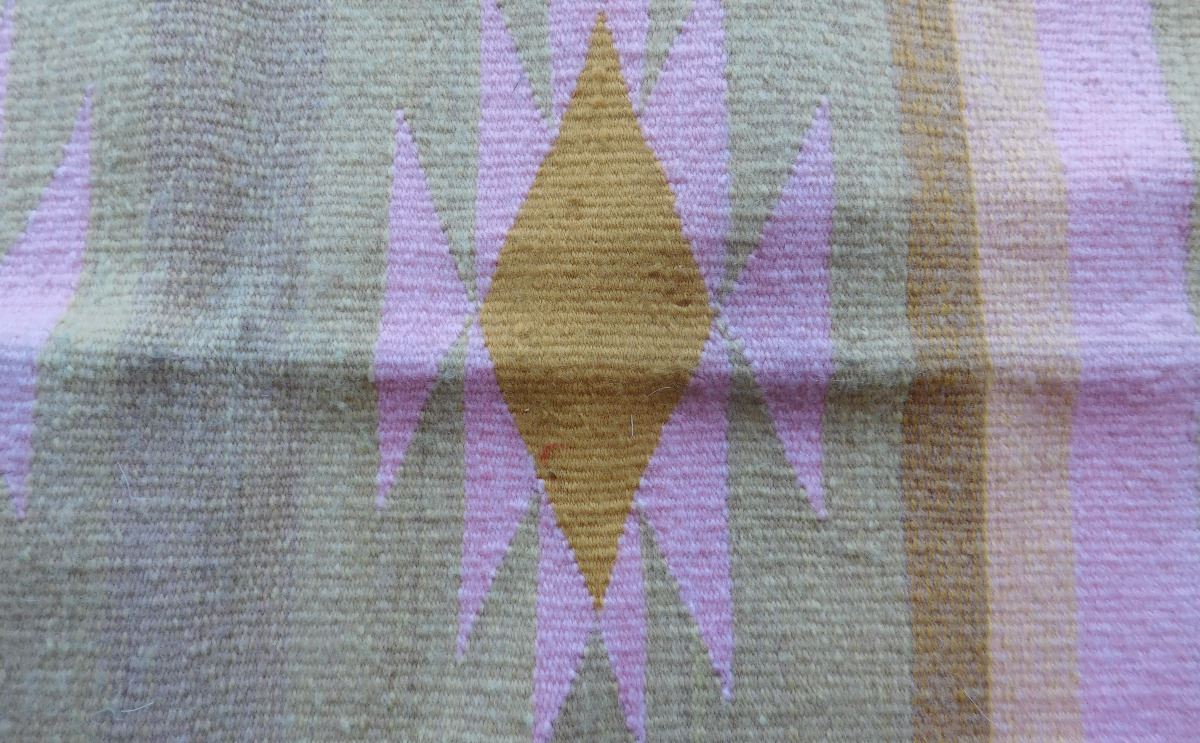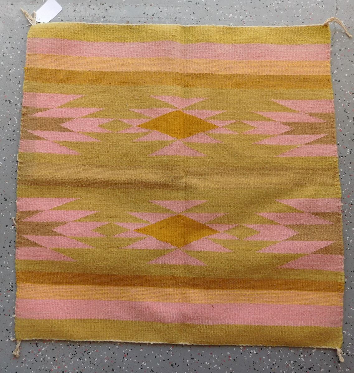 Navajo Saddle Blanket, circa 1950s. Made of wool and dye, the item measures 29" x 29". Navajo, Arizona. Condition: Minor moth damage and minor edge damage, see images. Shipping: $20.00.