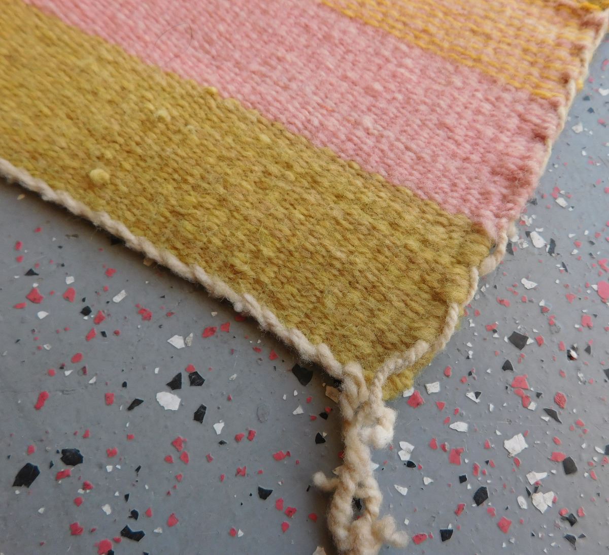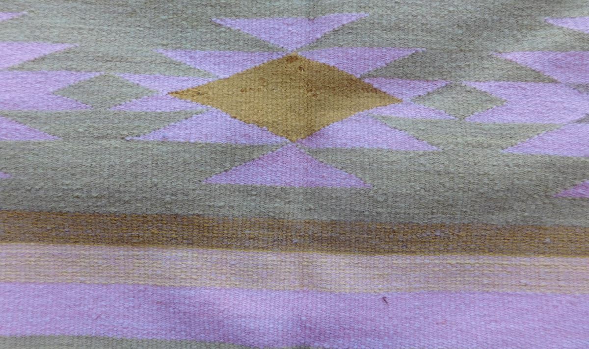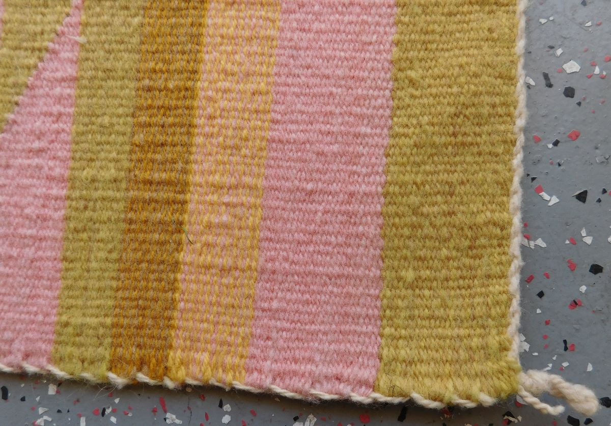 Navajo Saddle Blanket, circa 1950s. Made of wool and dye, the item measures 29" x 29". Navajo, Arizona. Condition: Minor moth damage and minor edge damage, see images. Shipping: $20.00.
