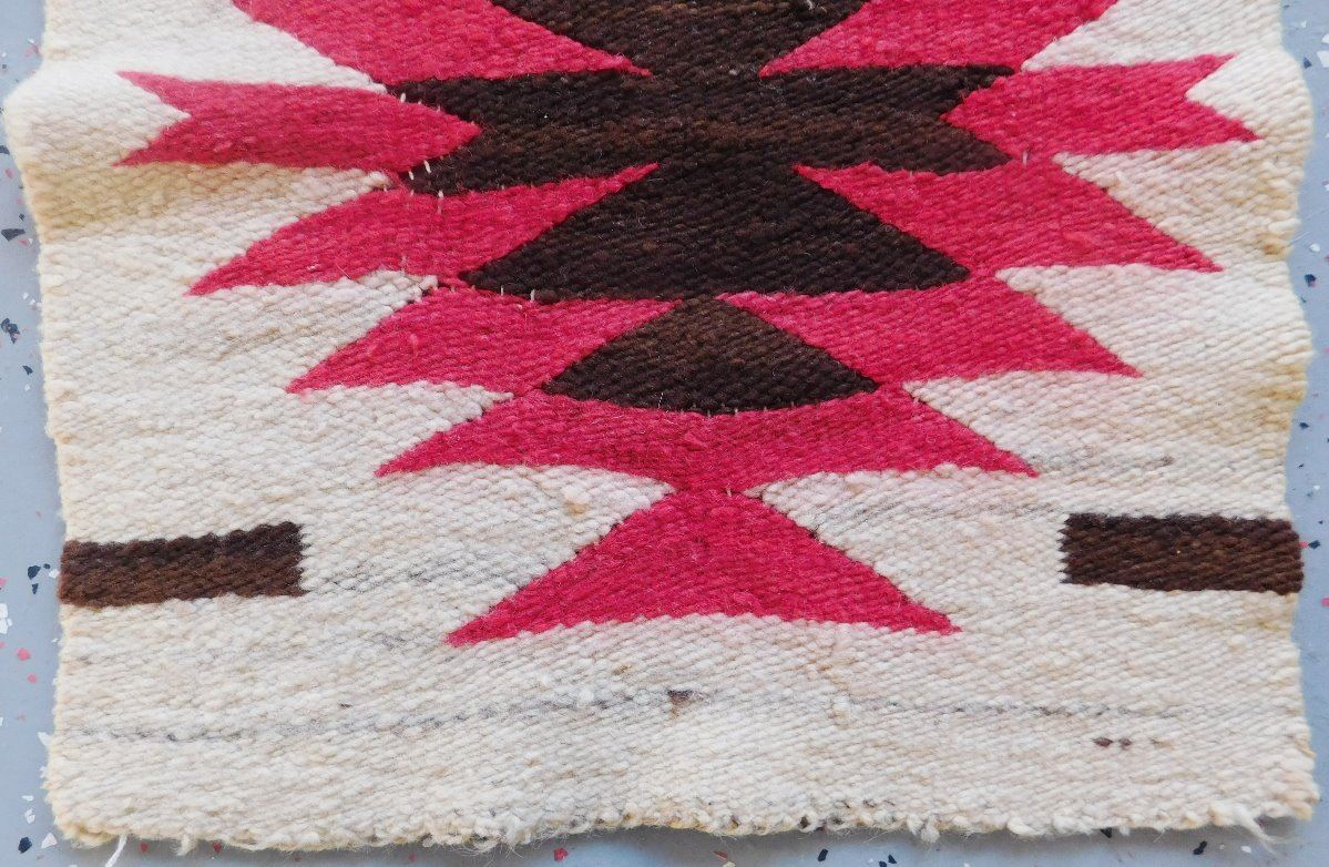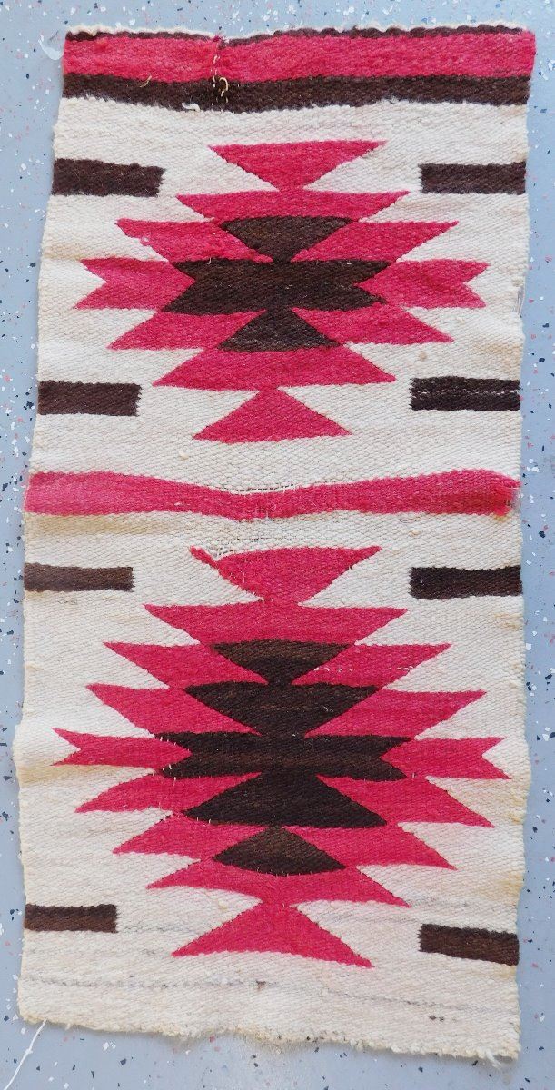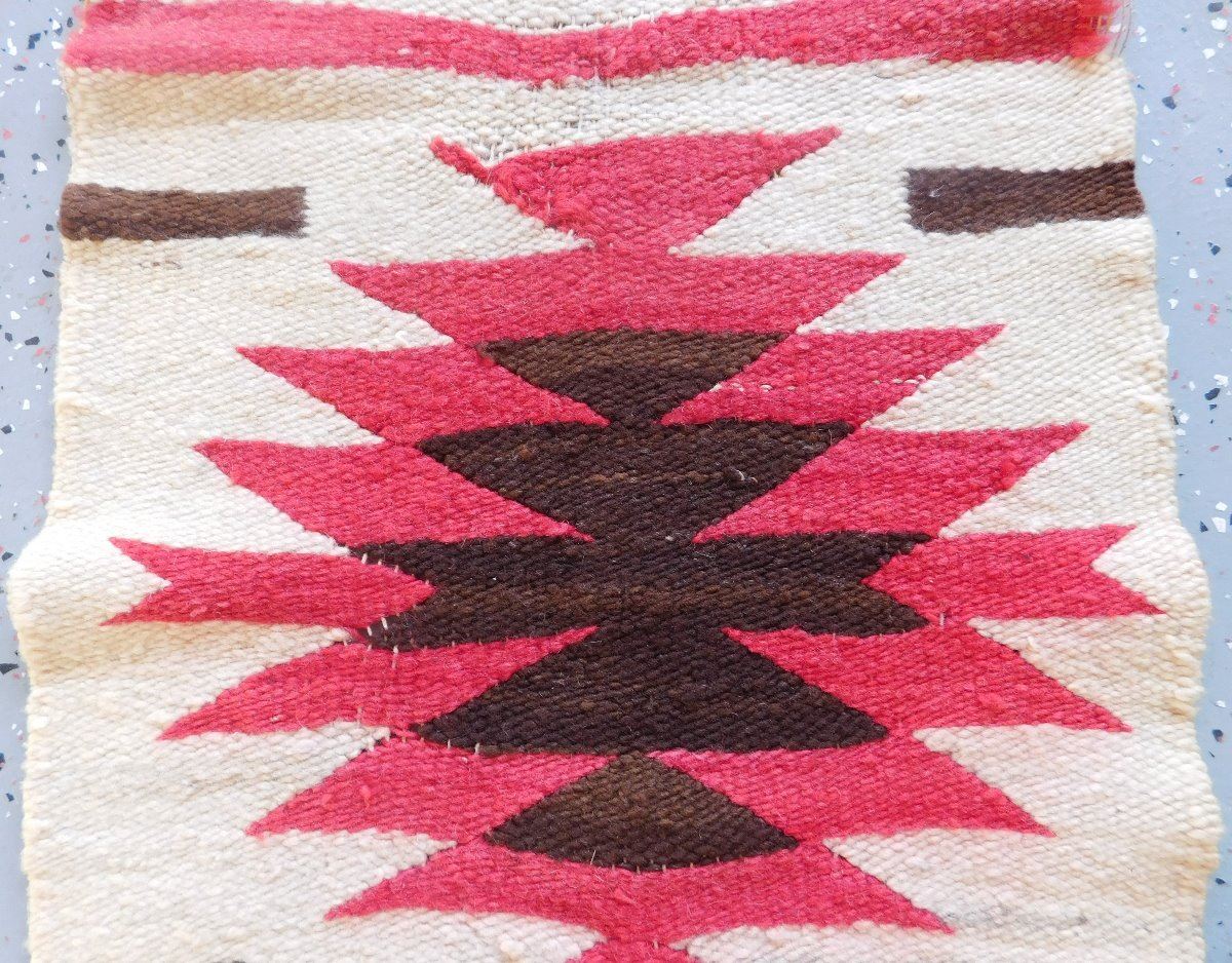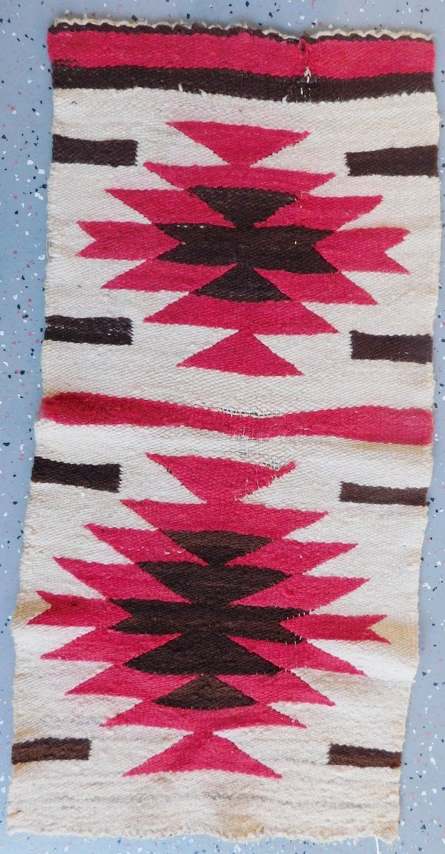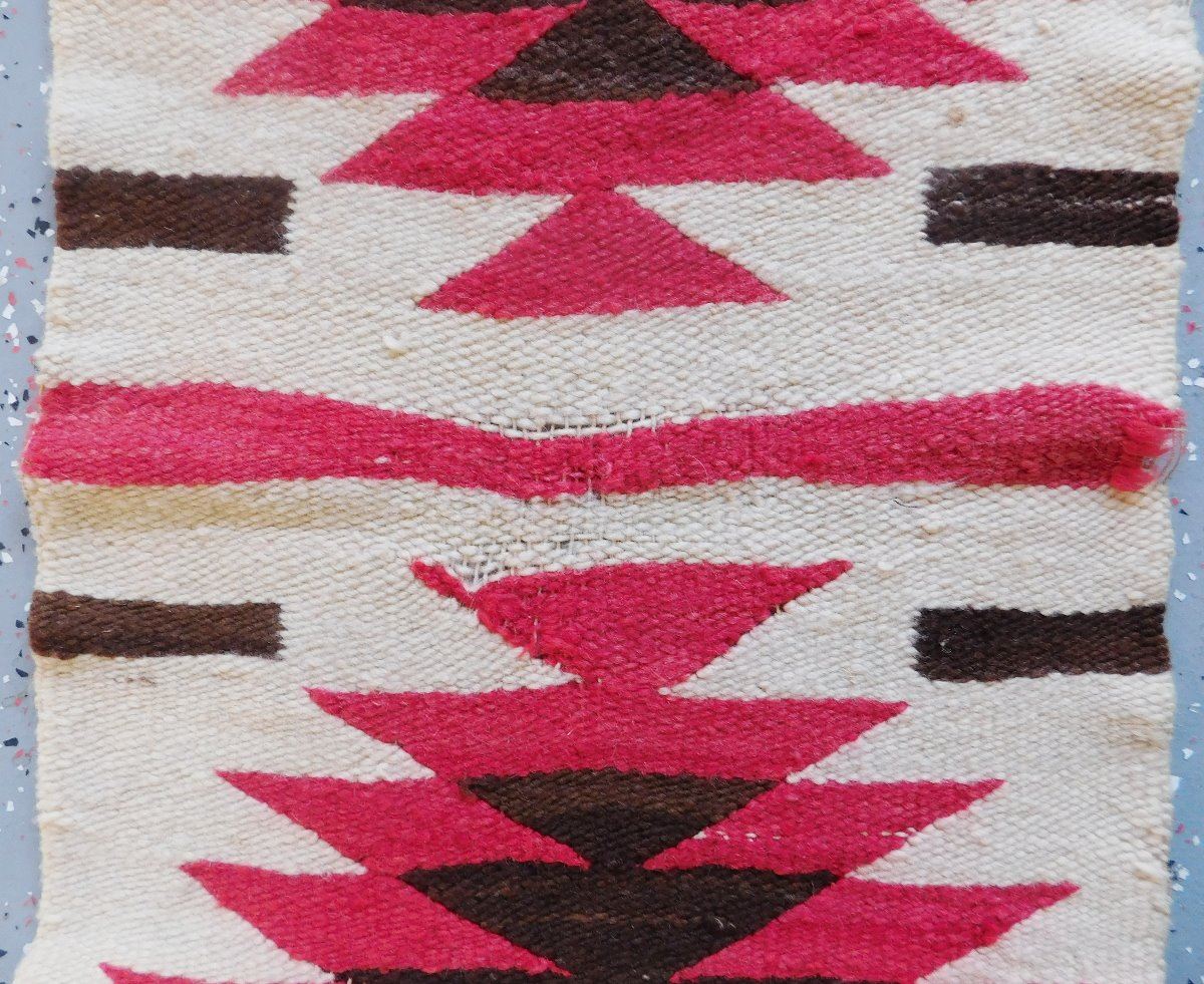 Navajo Saddle Blanket, circa 1940s. Made of wool and dye, the item is 33" x 16". New Mexico, Gallup. Nice looking weaving. Condition: Some wear, see images. Shipping: $20.00 w/insurance and signature.