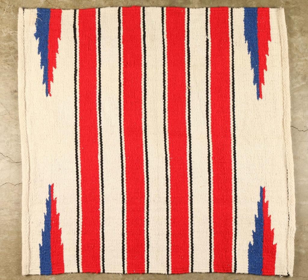 Red, white, blue and black with stripes and geometric designs. Measures 30"x30". A few small holes, otherwise good.