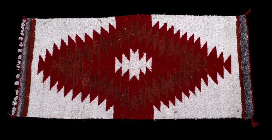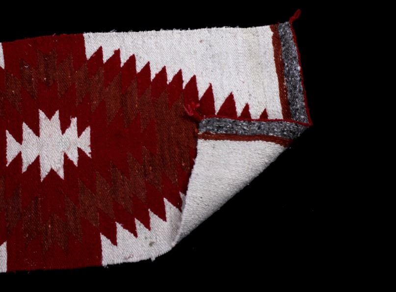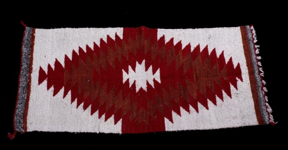 Showcased in this lot we have a small Navajo Native American salesman sample of a Ganado runner rug. The rug is made of white, red, grey, and orange wool. This would be sold or given as a sample of the larger full size rug. The rug is in good condition. The rug measures 39" long by 18" wide.