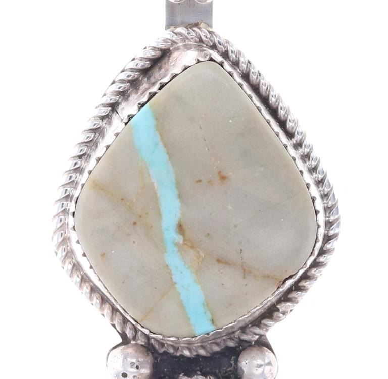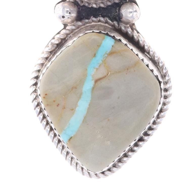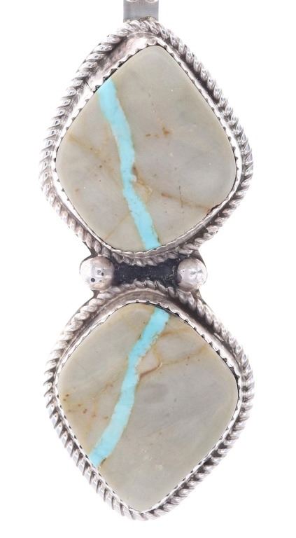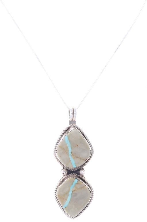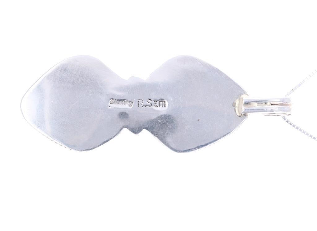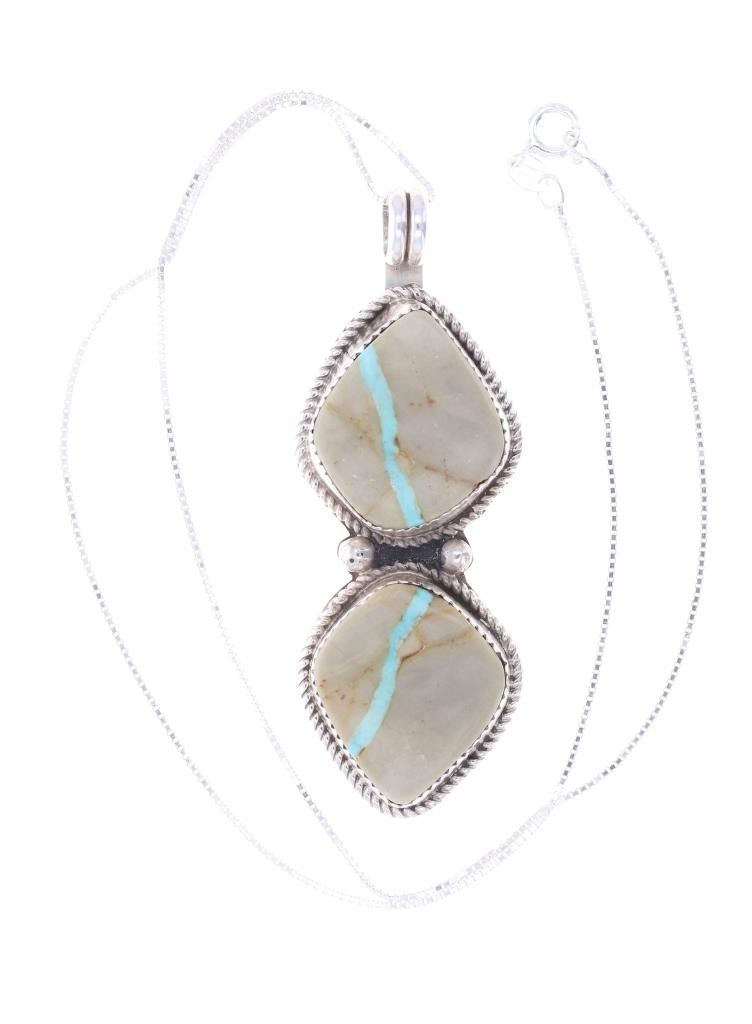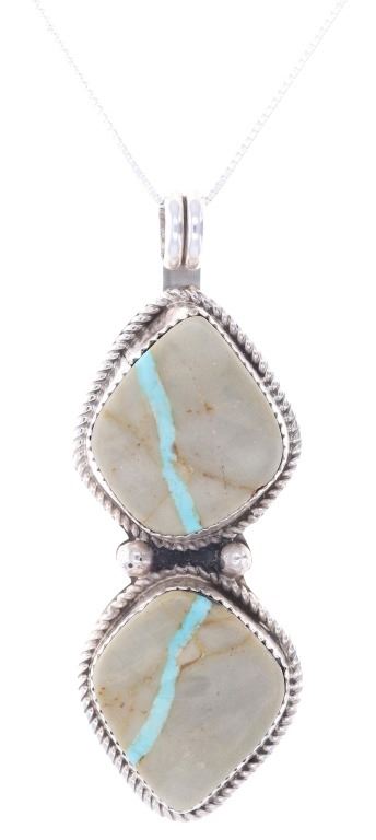 Featured in this lot is this Royston Ribbon Turquoise necklace from Navajo artist R. Sam. The necklace features a wonderfully and professionally crafted sterling silver and Royston Ribbon turquoise construction. The necklace shows a sterling silver pendant that shows a border of twisted rope border around the center stones and shows two examples of Royston Ribbon turquoise cabochon set into the center of the pendant. The pendant is marked on the back 'Sterling' and 'R. Sam.' The condition of this Navajo necklace is in good condition with no obvious signs of damage and shows good overall condition. The measurements of this necklace from clasp to clasp is 17 3/4" and the pendant measures 2 5/8" x 1" x 1/4". The collective weight of this necklace is 18.8g