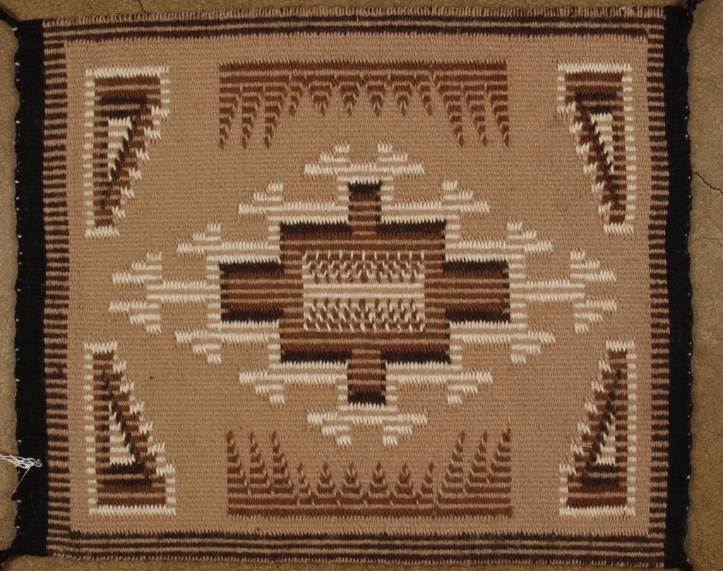 Cross geometric pattern in browns and black. Measures 15"x18".