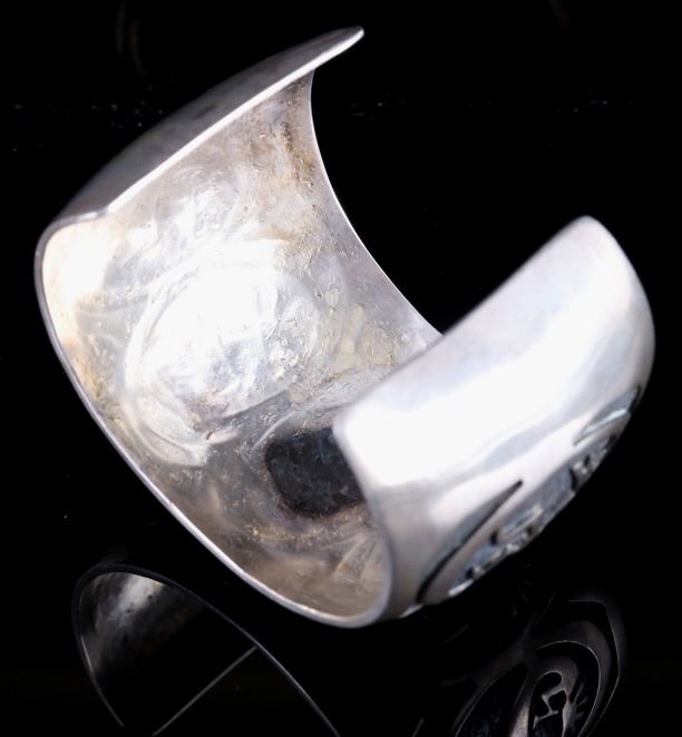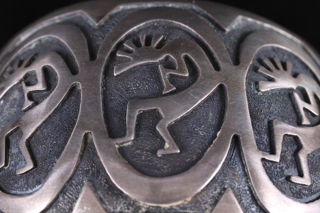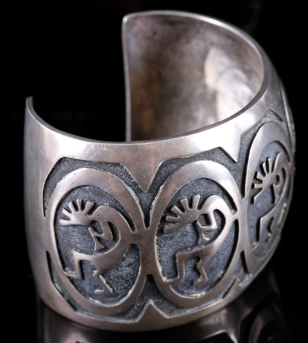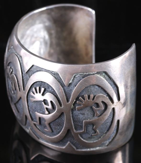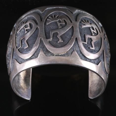 Included for your consideration in this lot is a sand cast Navajo Native American Indian cuff. The cuff shows a hand stippled background, with five Kokopellis adorning the face of the cuff. Overall, the cuff shows very good condition, with a warm silver patina. The bracelet weighs out to 93.7 grams of silver. The cuff measures 2 3/4" wide, and 2 1/4" tall. The inside circumference of the cuff equals approximately 7 1/2".