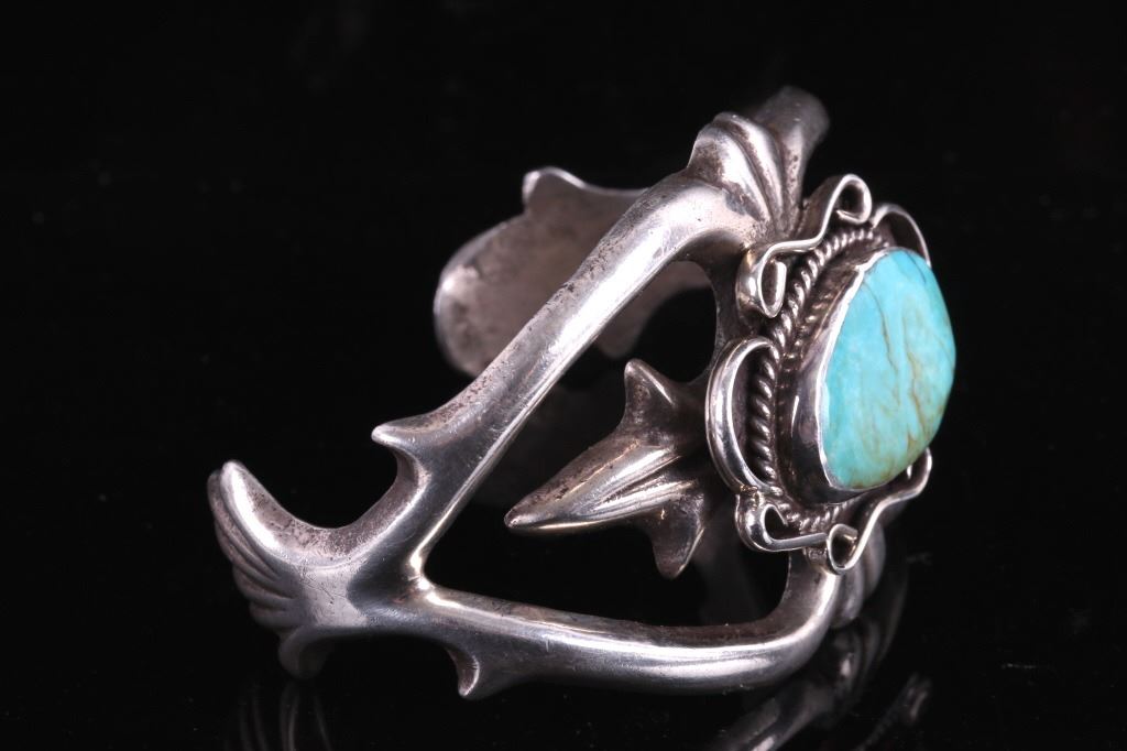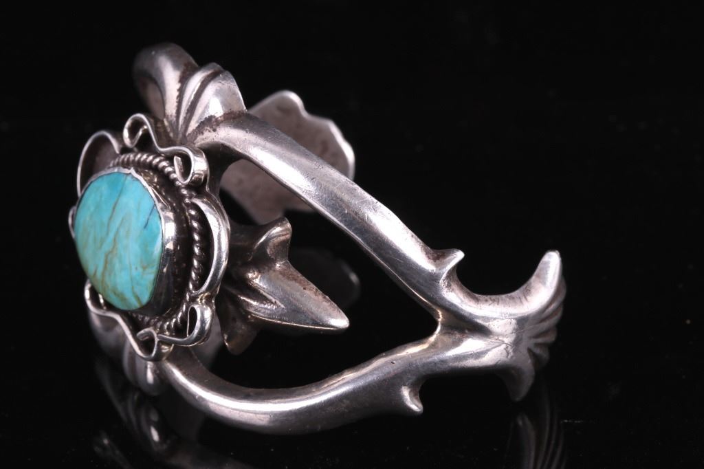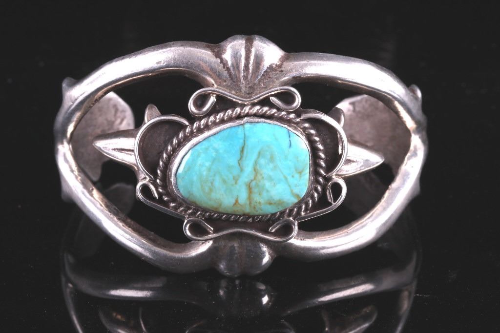 For your consideration is a Navajo sand cast sterling silver and sleeping beauty turquoise bracelet. Set in a sterling shadow box surrounded by silver dot accents is a beautiful sleeping beauty turquoise gem stone. Elegant metal bands surround the shadow box and the exterior finish of the bracelet has been polished to remove the casting imperfections. The back of the bracelet has been left untouched. Interior circumference measures 6.75".