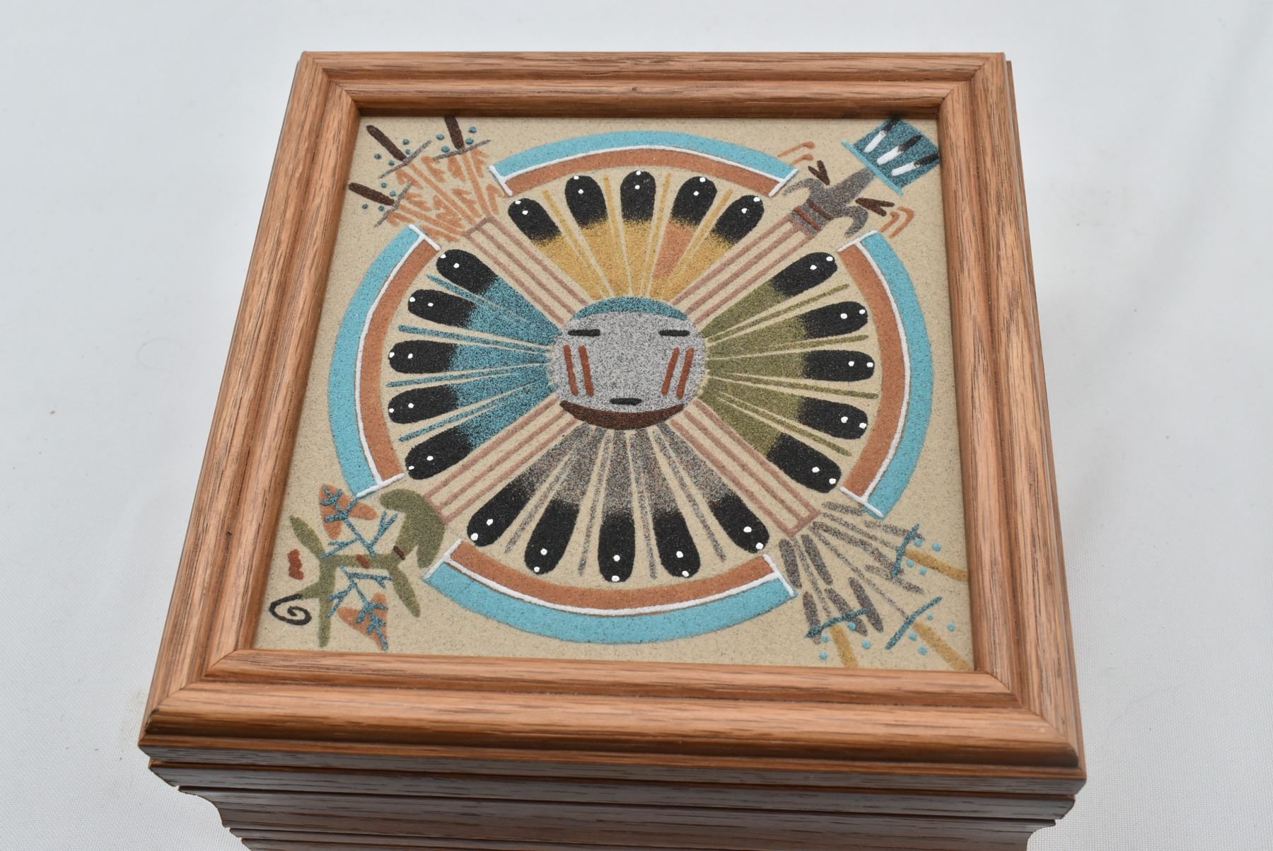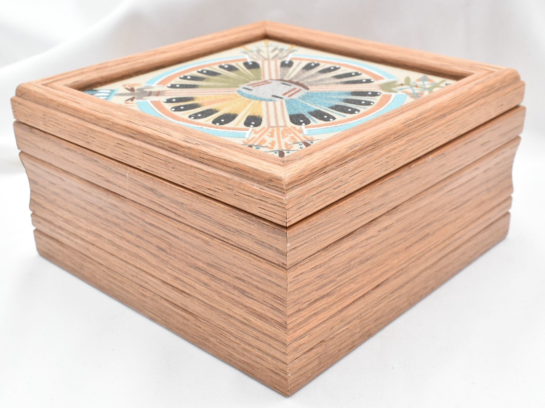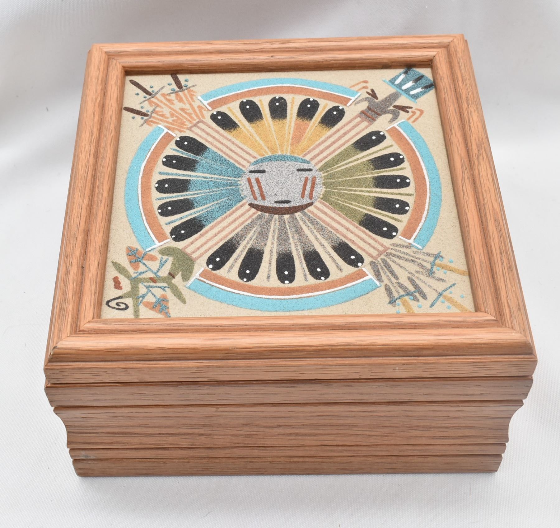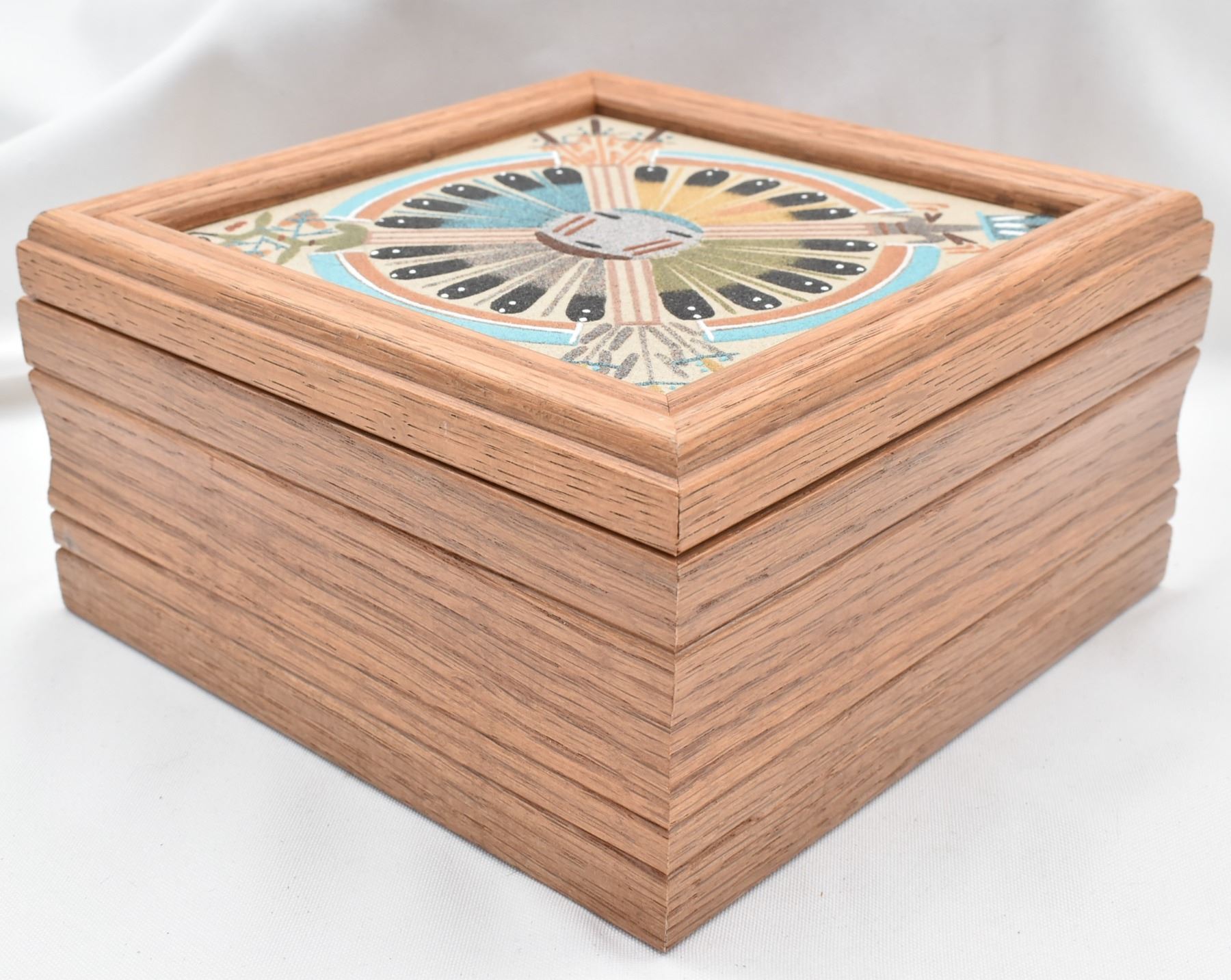 Native American Navajo Sand Painted Lidded Wood Box by Gloria Nez of Sanostee NM, measures 7'' square, this is a wood box with a sand painting on the lid