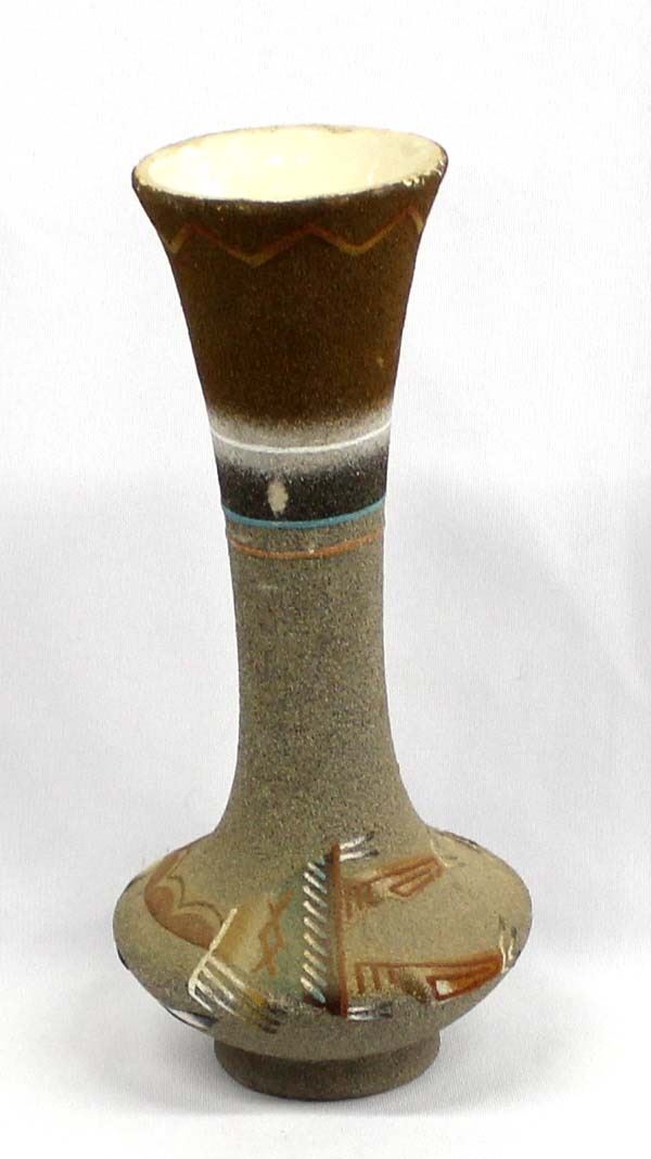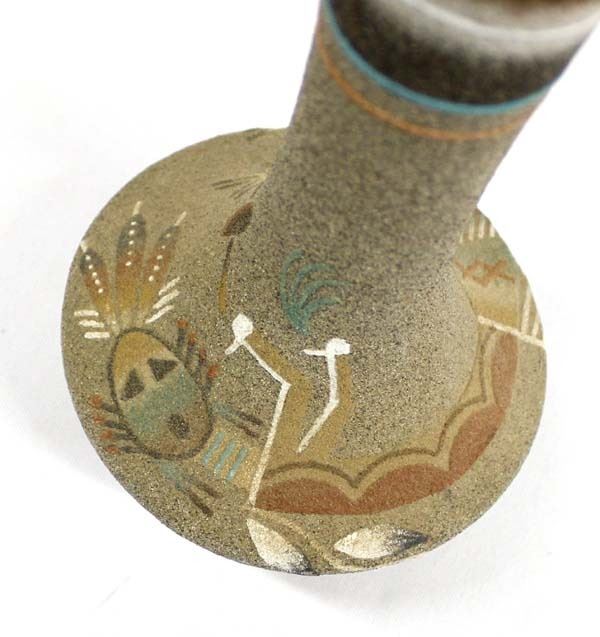 Native American Navajo Sand Painted Pottery Vase by P. Morgan, Hump Back Yei, signed on the bottom, measures 9.5'' x 4.5'', some minor loss of sand paint around rim