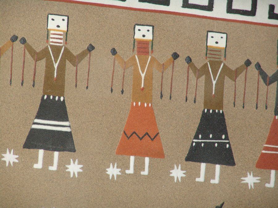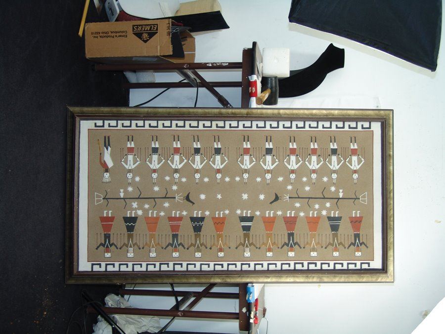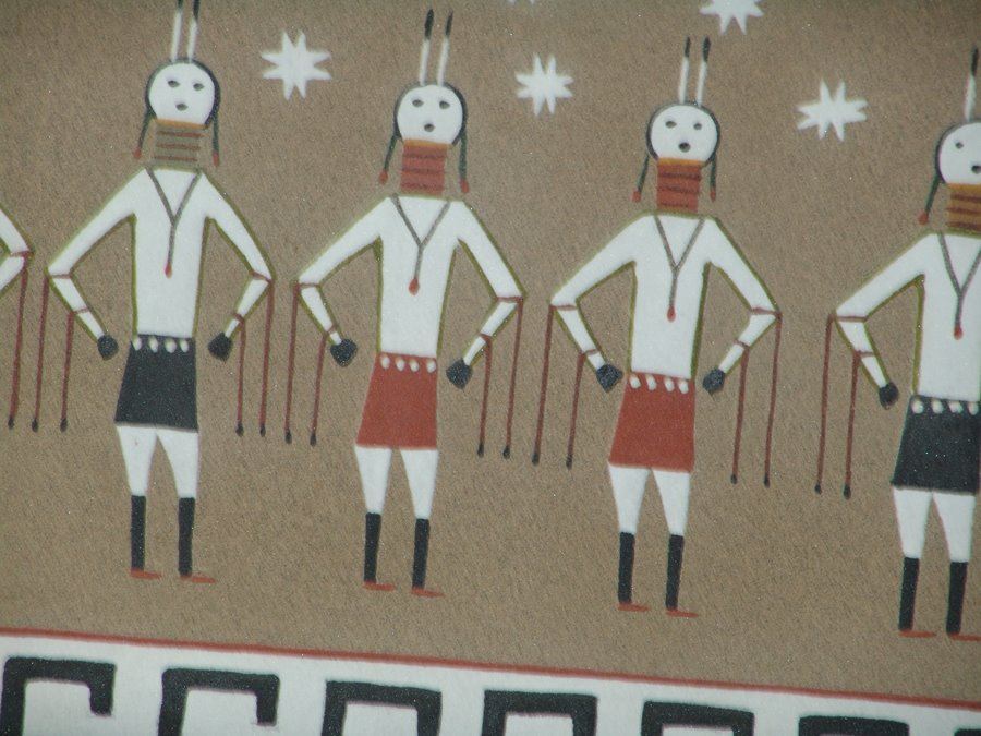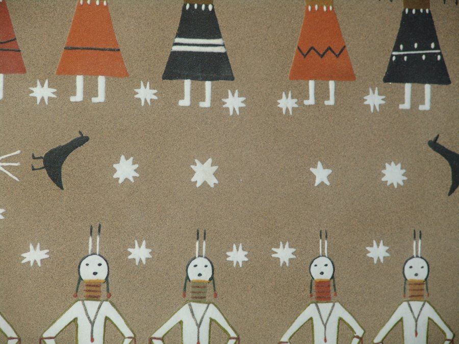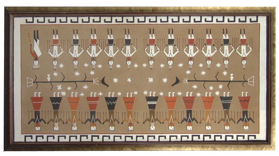 Signed original sand painting on board showing "A Double Row of Yei Bei Chai Dancers in Yei Costumes." Very good condition, framed. A large and impressive work.,Late 1900s,24" x 27" (28" x 52")