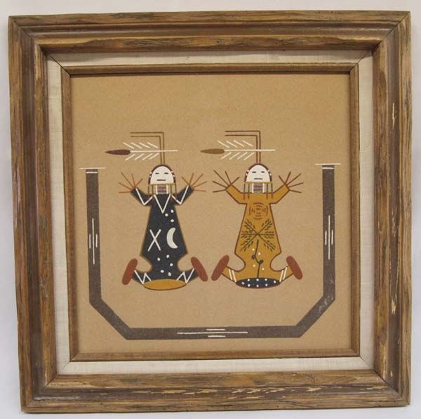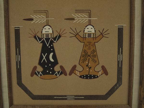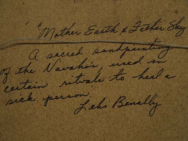 Native American Navajo Sand Painting - Lehi Benally. Warm, earth colors with figures depicting ''Mother Earth'' and ''Father Sky''. Painted on board and in a wood frame. Signed on the back with title, description and artist's name, Lehi Benally. Visual measures 11.5'' x 11.5''.