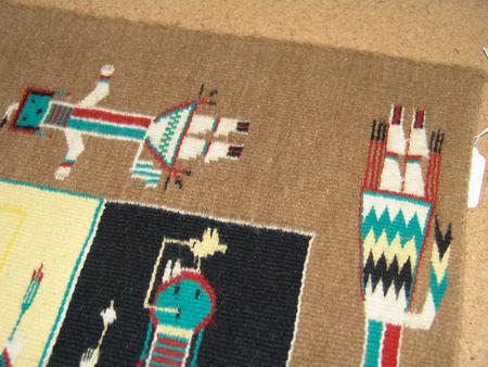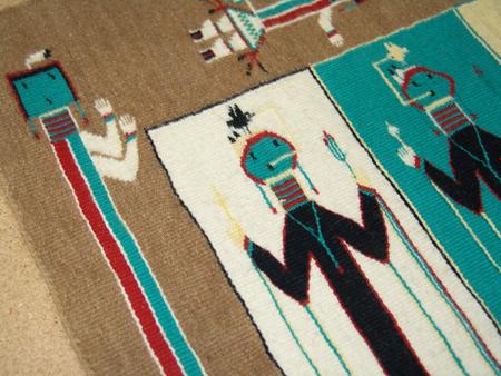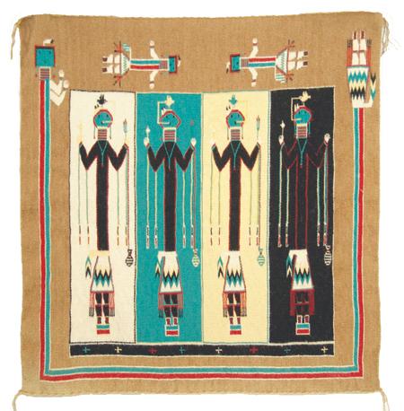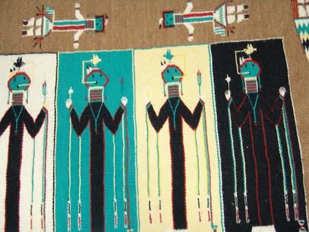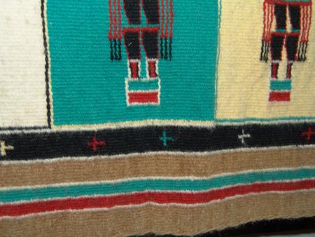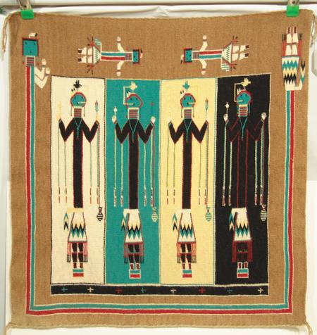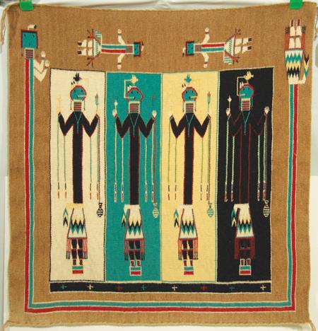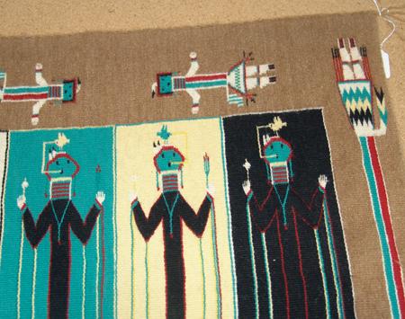 Rare, fine weave, four-figure Yei sand painting-style weaving. Blue ribbon winner, Gallup Ceremonial 1969. Purchased from Foutz in 1974 for $2,500; appraisal value $7,500. Condition: very good. 29" x 29"