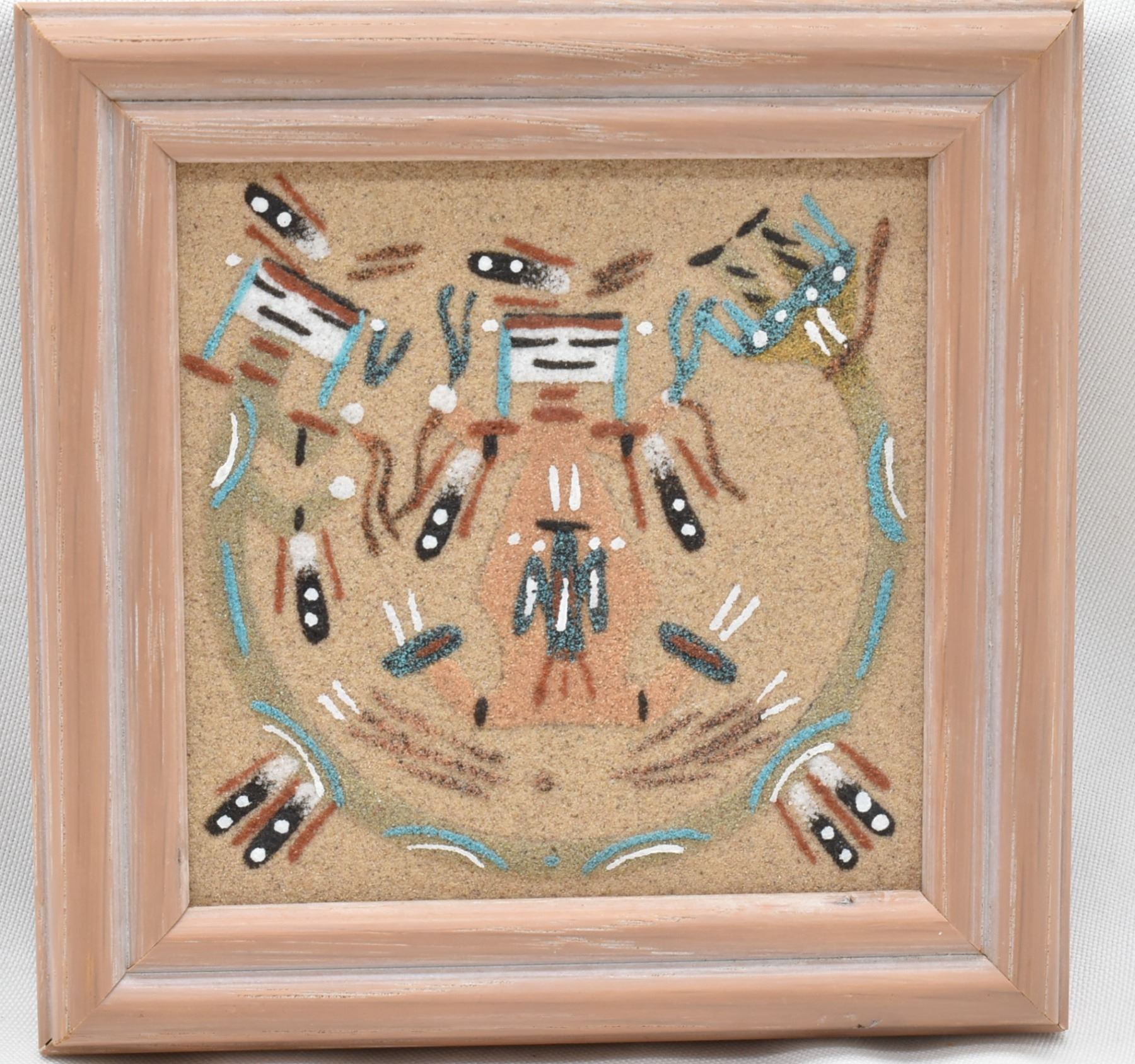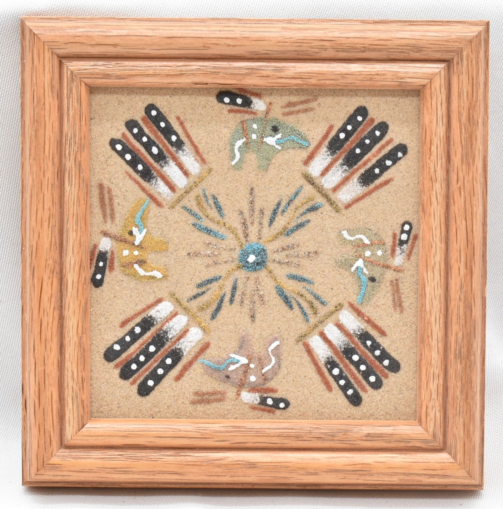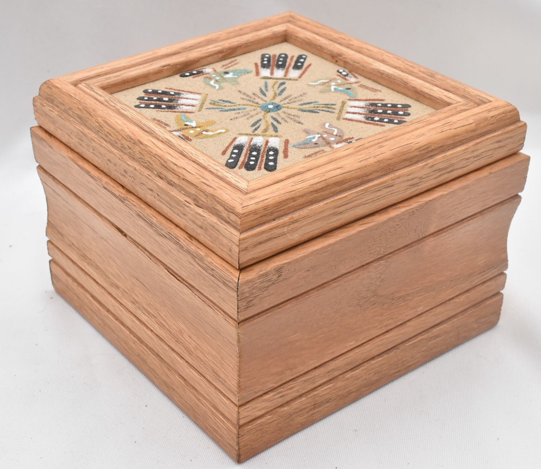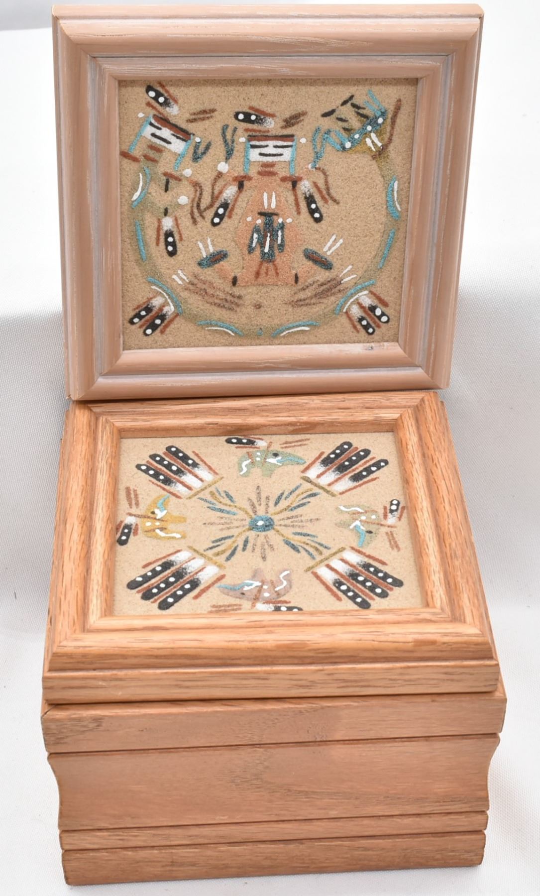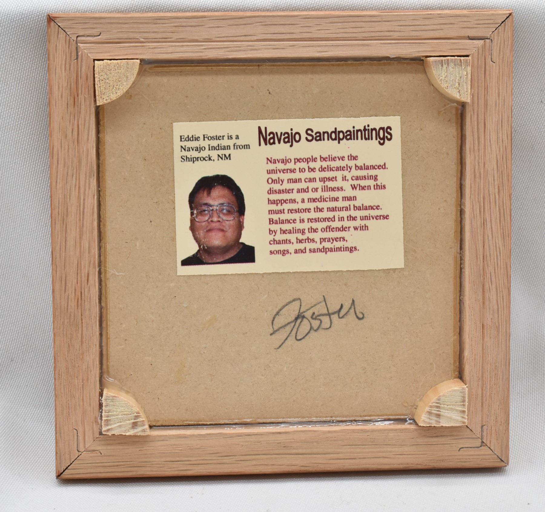 Native American Navajo Sand Painting and Sand Painted Lidded Box by Eddie Foster of Shiprock NM, framed sand painting measures 5'' square, the lid on the wood box has a sand painting on it, box measures 5'' square, both pieces are signed by the artist