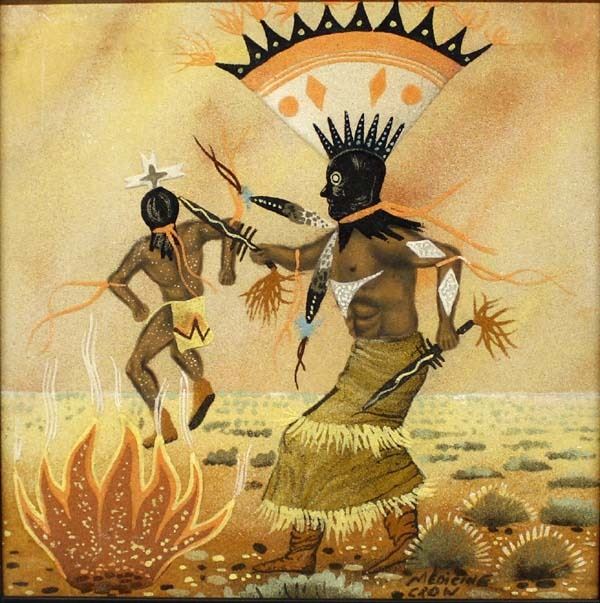 Native American Navajo Framed Sand Painting ''Western Apache Mountain Spirit Dancers'' by Medicine Crow, art in natural sands, visual measures 15.5''square,