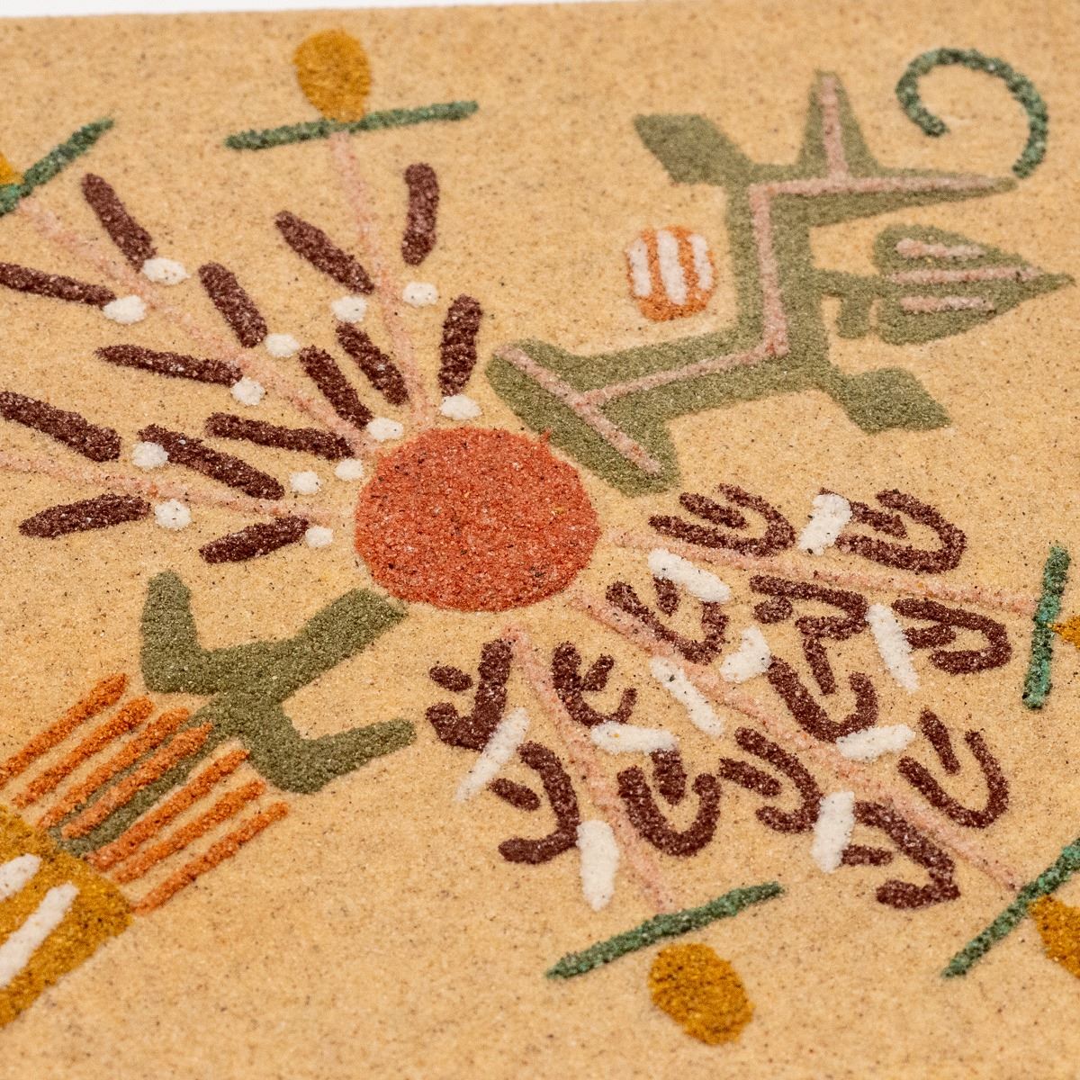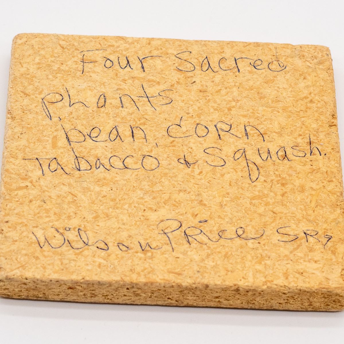 Small Native American Navajo Sand Painting ''Four Sacred Plants'' (Beans, Corn, Tobacco, and Squash) by Wilson Price, Sr., measures 4'' square and is signed on the back