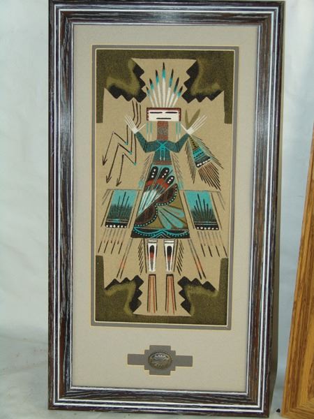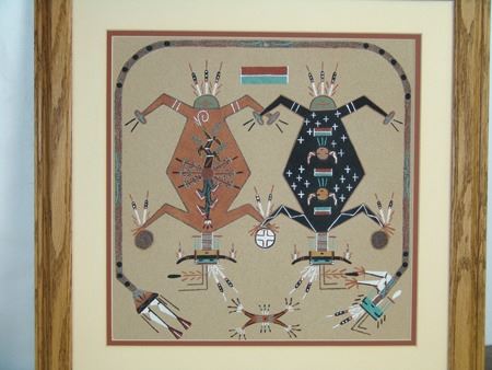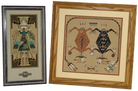 Late 1900s, Pair of beautiful matted and framed works, the smaller by Valerie Begay, the other titled "Mother Earth, Father Sky" by C. (?). Very good condition. Larger 13" x 13" (19" x 19" framed)
