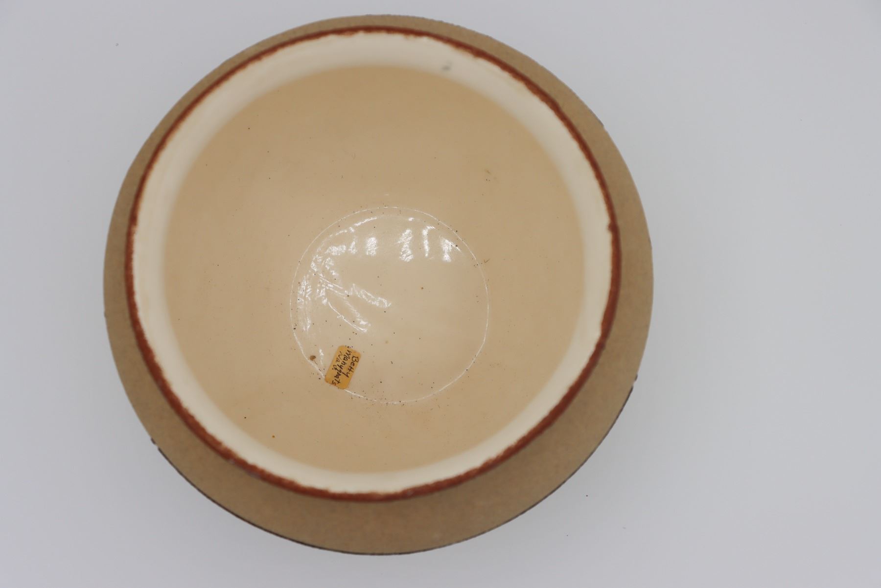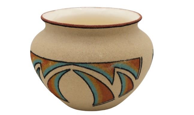 Southwestern/ American Indian sand vessel signed: J. Mestale near base. Hand-painted using natural colored sands, glazed inside.