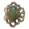 More elaborate design, heavy, sand cast all-silver bracelet with single turquoise stone. 6" plus 1" gap x 3" wide