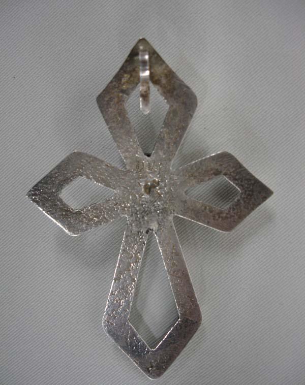 Navajo Sandcast Cross Pendant With Turquoise Nugget, measures approx. 3 1/4" x 2 1/4". SHI $15.