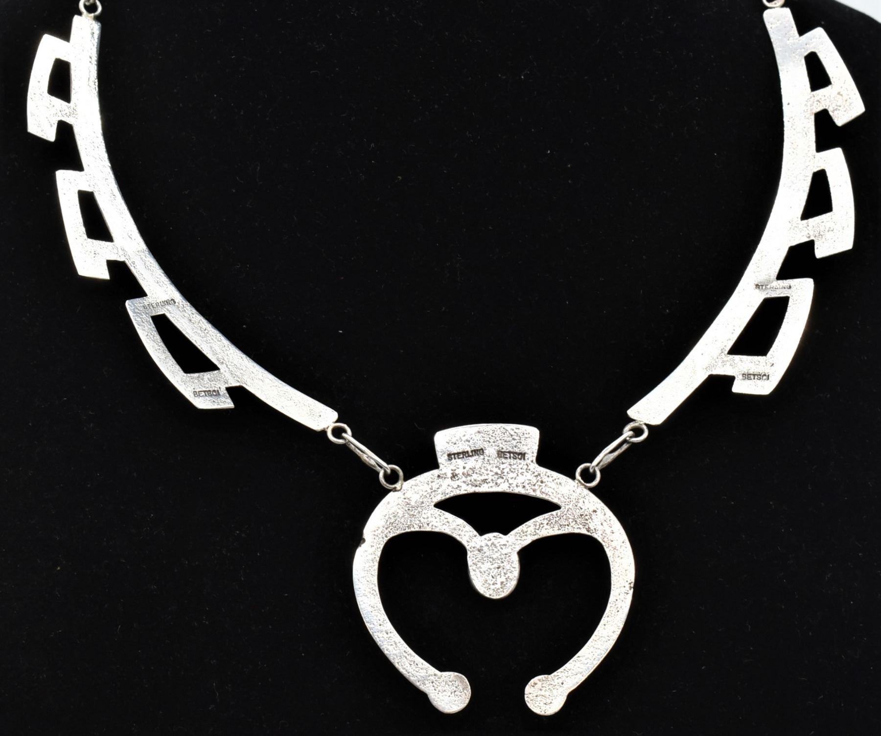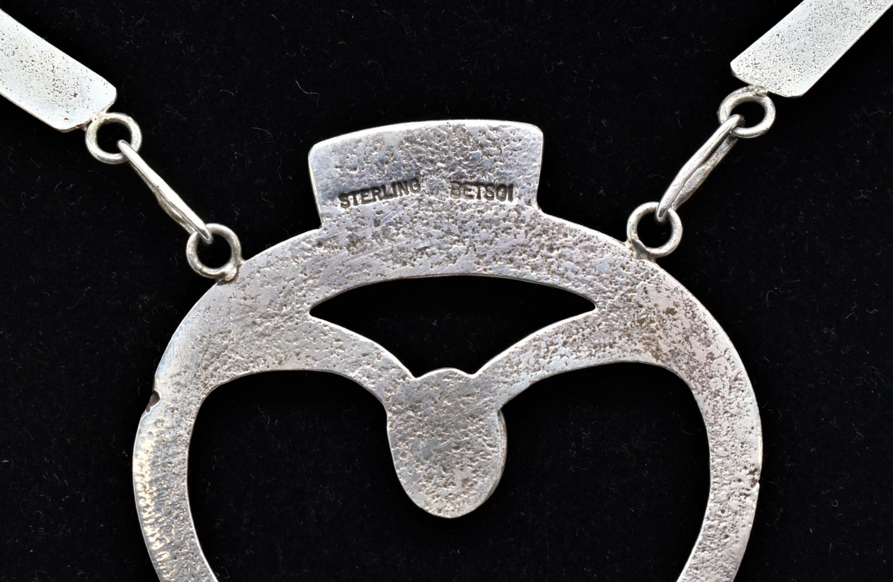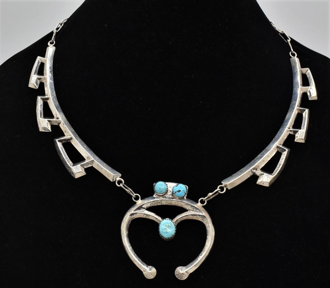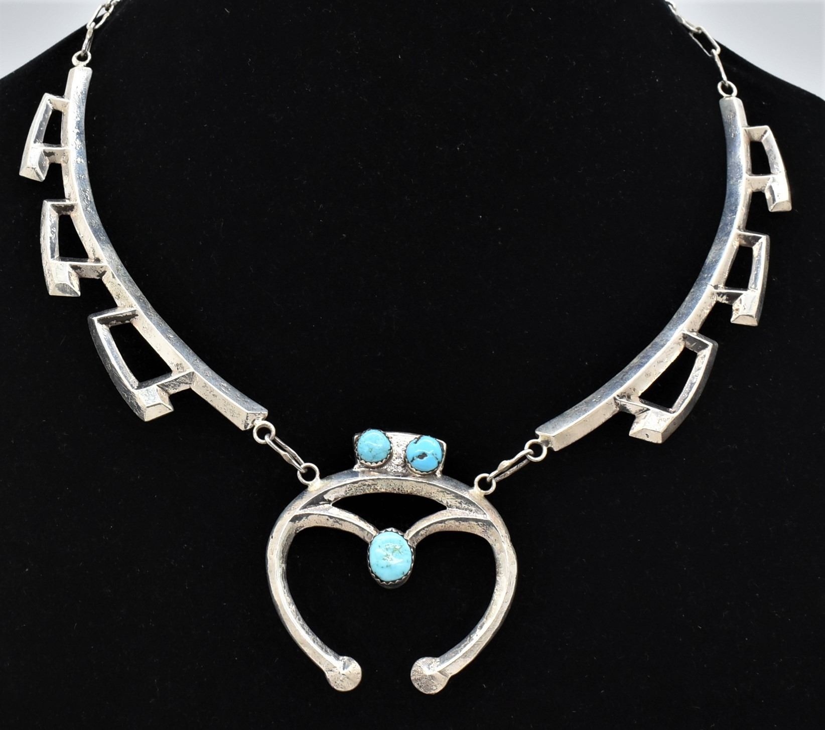 Native American Navajo Sandcast Sterling Turquoise Squash Blossom Necklace by Raymond Betsoi, measures 22''L end to end, naja measures 2'' x 2'', stamped sterling and hallmarked, hand wrought chain, side pieces measure 4.5''L x .75''W, total gram wt. of 68.78 grams, total ounce wt. of 2.426 ounces, absolutely stunning