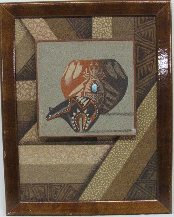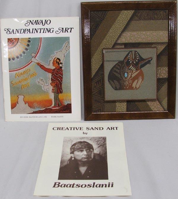 3 Pieces - Navajo Sand painting By Eugene Baatsoslanii Joe and ''Navajo Sand painting Art'' soft back booklet by Eugene Baatsoslanii Joe & Mark Bahti, signed 'Best Wishes Baatsoslanii'. Including a pamphlet with picture and bio of artist. Sand Painting measures approx. 8 1/2'' x 11 1/2'', framed in a wood frame. SHI $35.