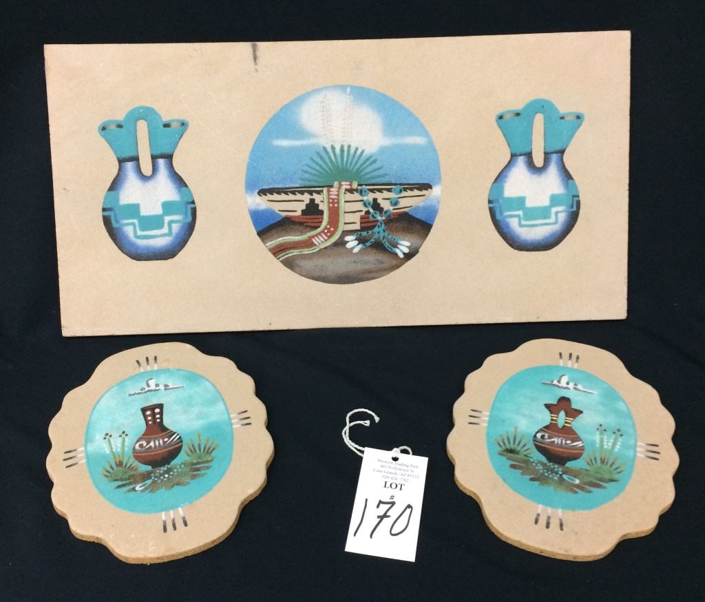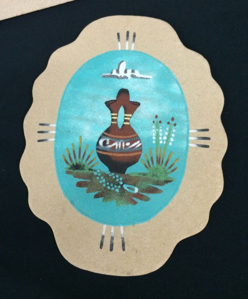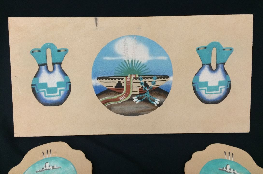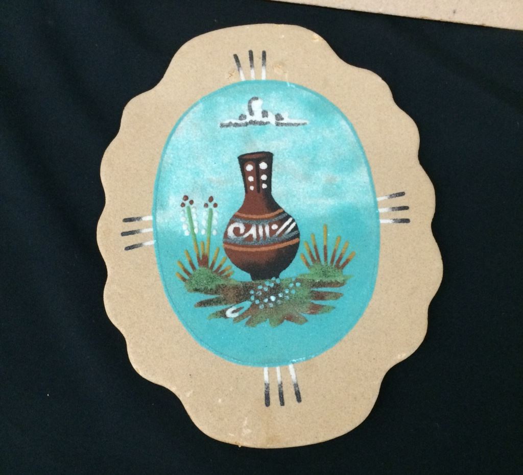 There are 3 original sandpaintings for 1 money in this lot. The larger one measures 24” X 12” and the other two ovals are 8” X 10.5”. These have slight damage, please look closely at pics.