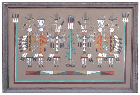 Large beautiful original sandpainting done on particle board featuring very detailed yei figures. 23-1/2" x 35-1/2" (27-1/2" x 39-1/2" framed)