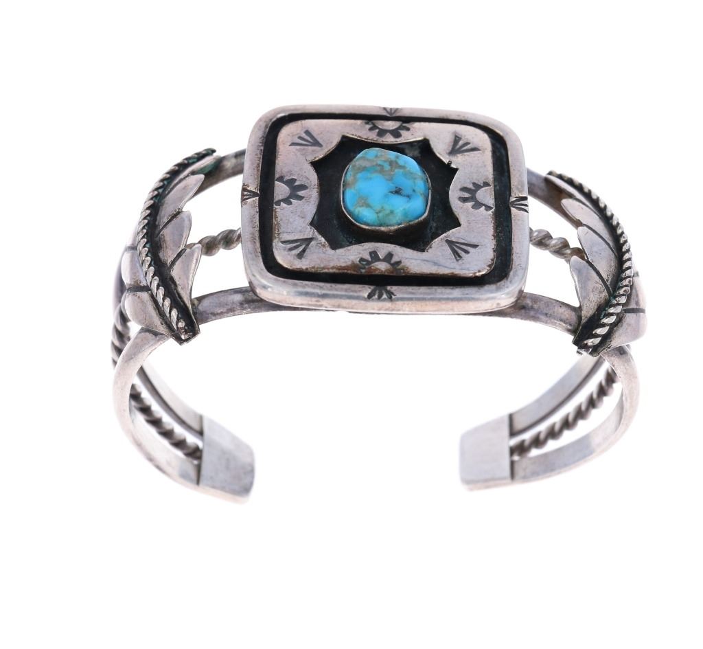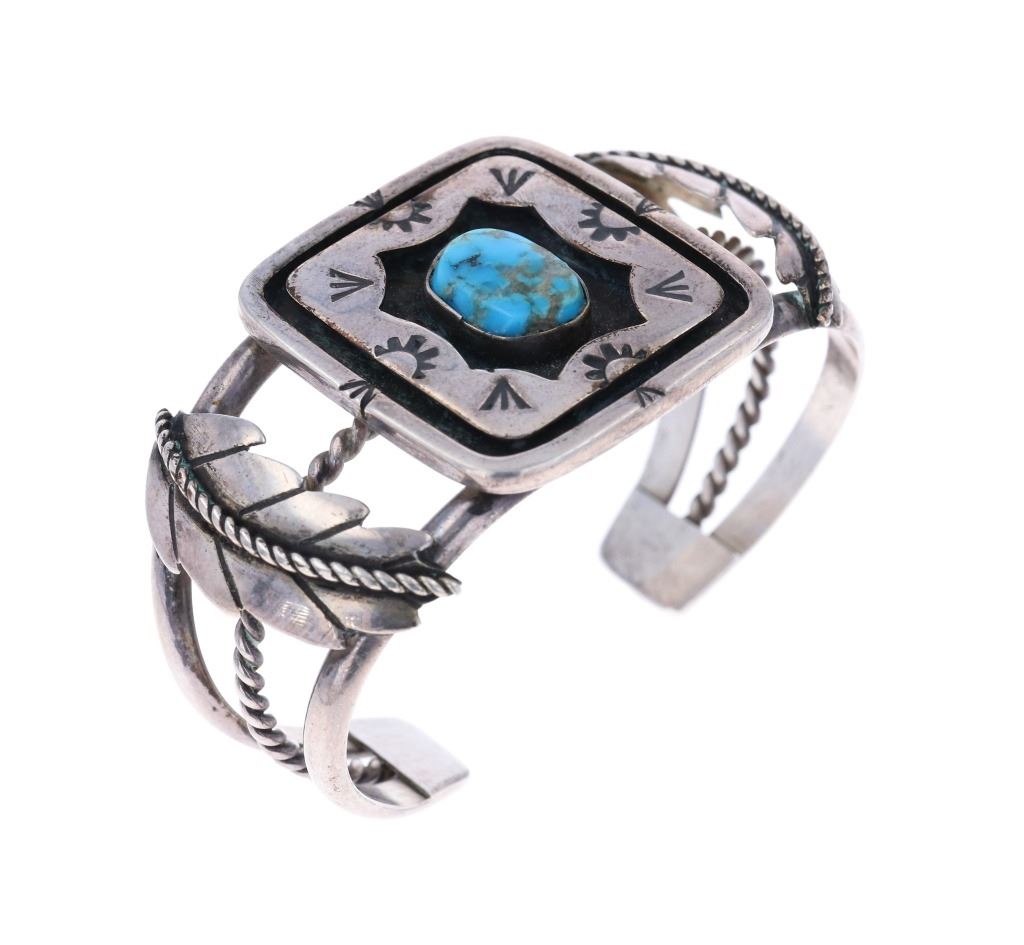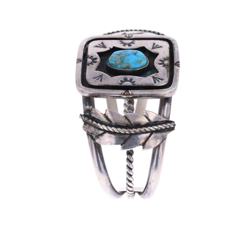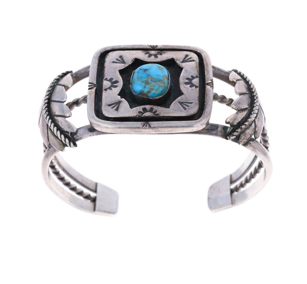 Featured in this lot is this Navajo sterling silver frame shadowbox bracelet. The bracelet is wonderfully and professionally crafted sterling silver and turquoise construction. The bracelet features a triple bar frame with a twisted rope center bar and leaf adornments to the shoulders of the bracelet. The central square face features a shadowbox design that is stamped with geometric patterns with a nugget blue gem turquoise cabochon set into the center of the bracelet. The condition of this sterling silver bracelet is good with no obvious signs of damage and shows good overall condition. The measurements of this bracelet is 1 7/8" x 2 1/2" x 1 3/8" and the circumference is 4 1/4". The overall weight of this bracelet is 43.7g.