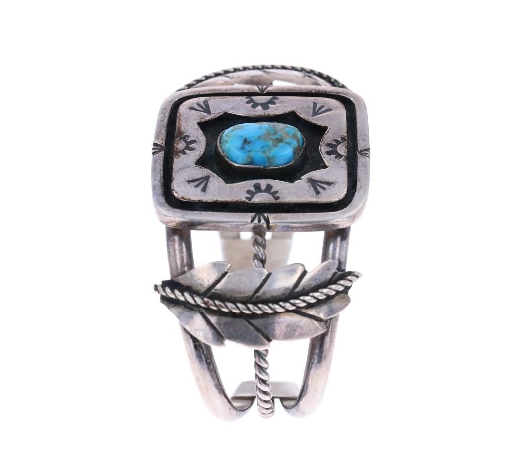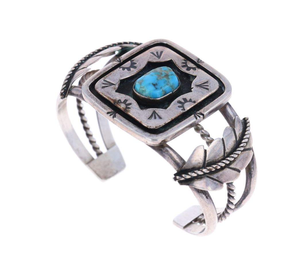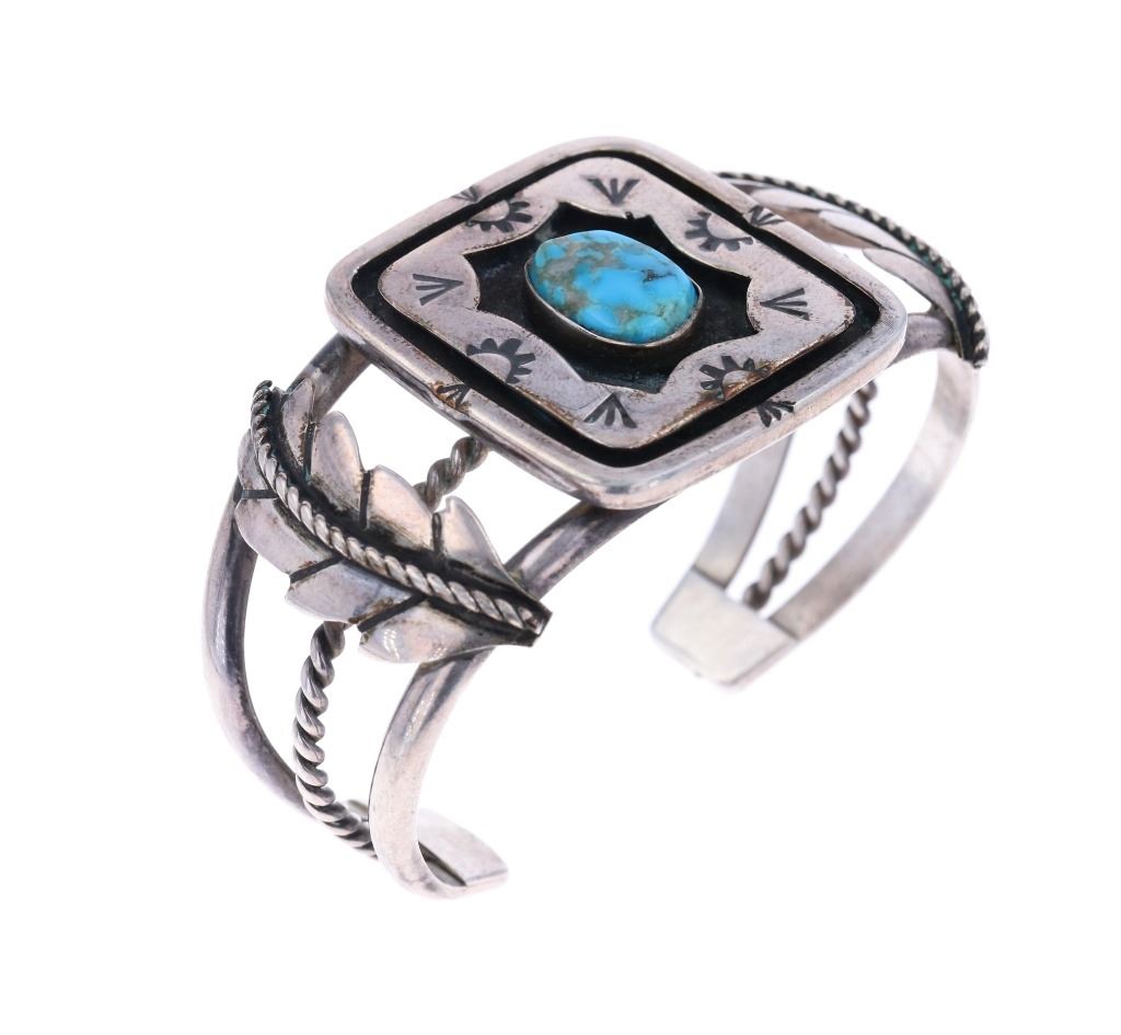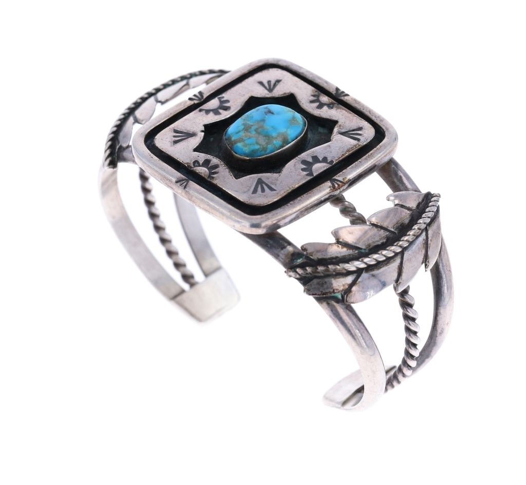 Featured in this lot is this Navajo sterling silver frame shadowbox bracelet. The bracelet is wonderfully and professionally crafted sterling silver and turquoise construction. The bracelet features a triple bar frame with a twisted rope center bar and leaf adornments to the shoulders of the bracelet. The central square face features a shadowbox design that is stamped with geometric patterns with a nugget blue gem turquoise cabochon set into the center of the bracelet. The condition of this sterling silver bracelet is good with no obvious signs of damage and shows good overall condition. The measurements of this bracelet is 1 7/8" x 2 1/2" x 1 3/8" and the circumference is 4 1/4". The overall weight of this bracelet is 43.7g.