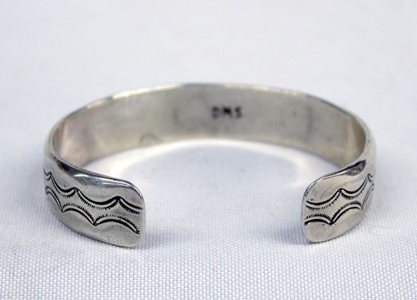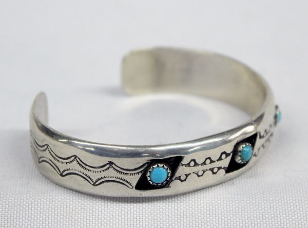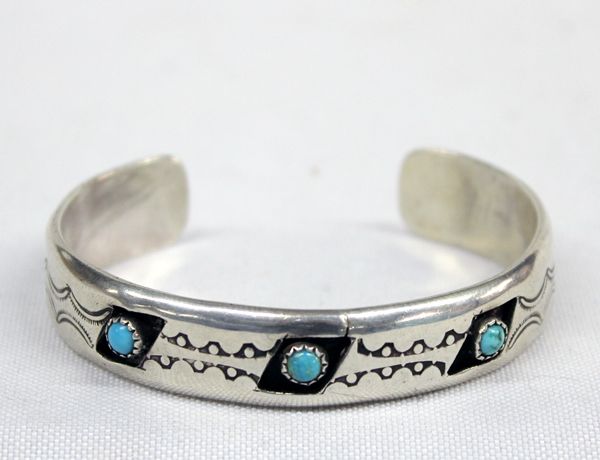 Navajo Shadowbox Sterling & Turquoise, Signed. Beautiful designwork in this shadowbox style bracelet. Three round turquoise cabochons set within a parallelogram box with silver stampwork in between each stone. Small Break in silver on front above one shadow box. Shows in picture #1. Nothing dramatic as far as taking away from the beauty of the bracelet. Measures 7'', 1/4'' wide, signed ''DMS''.