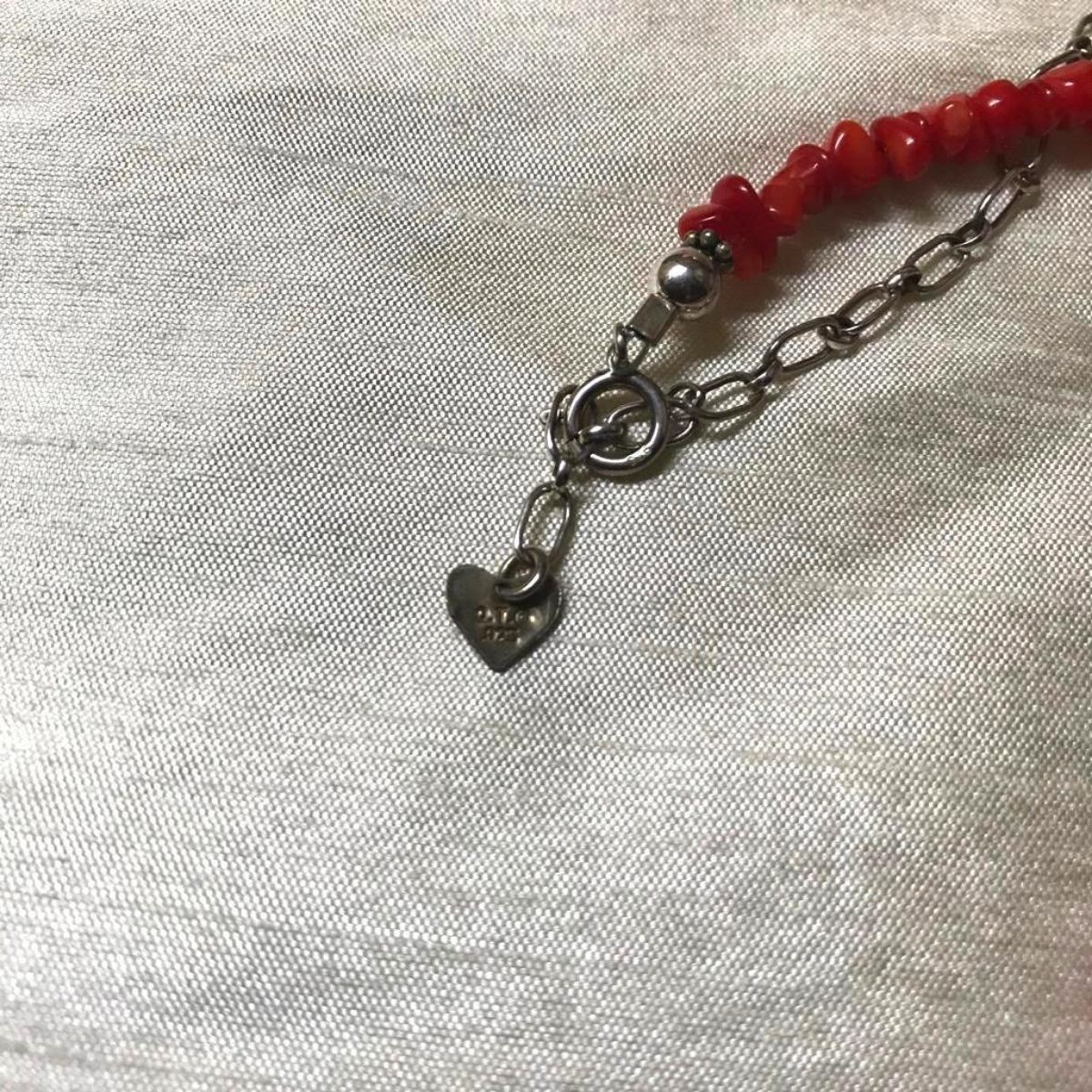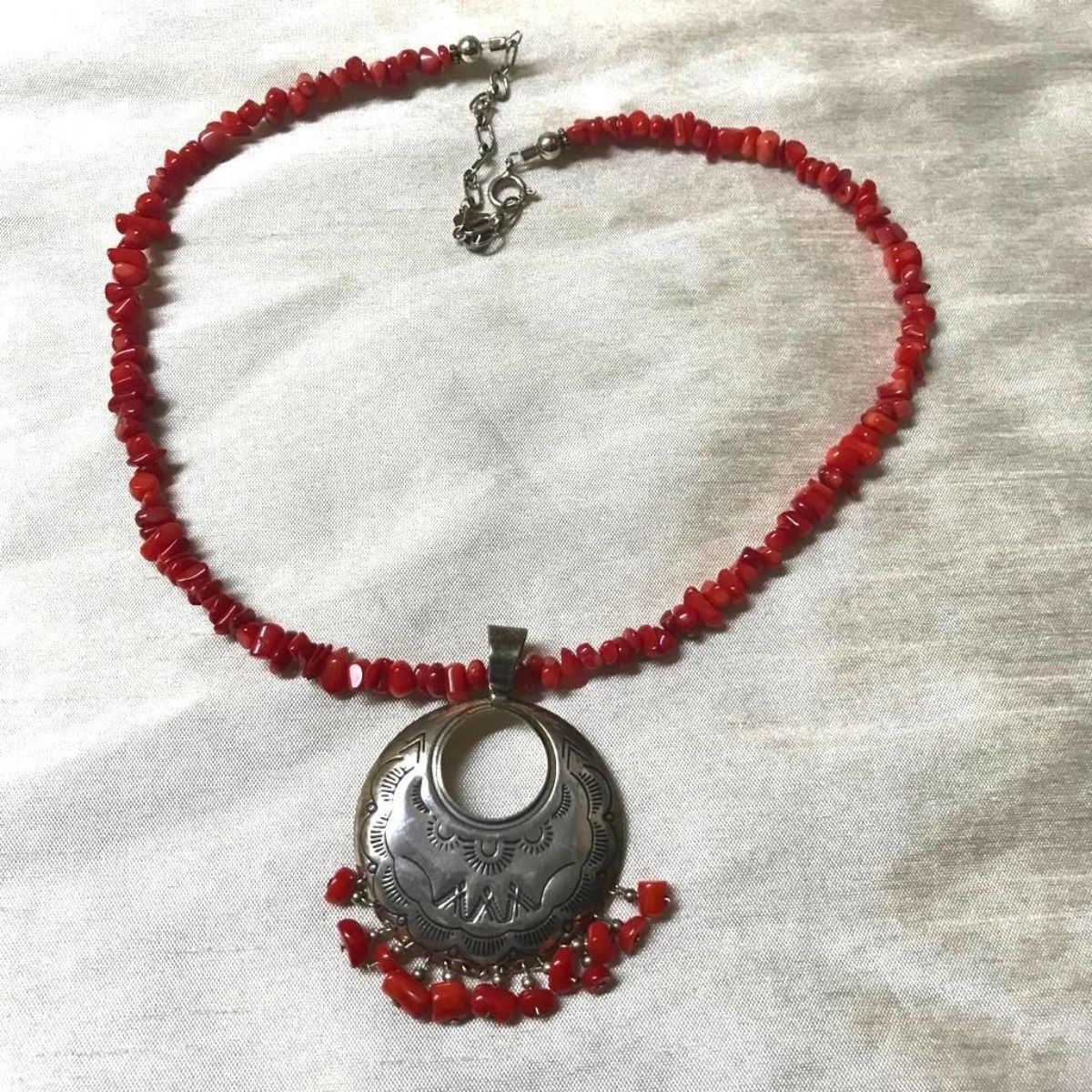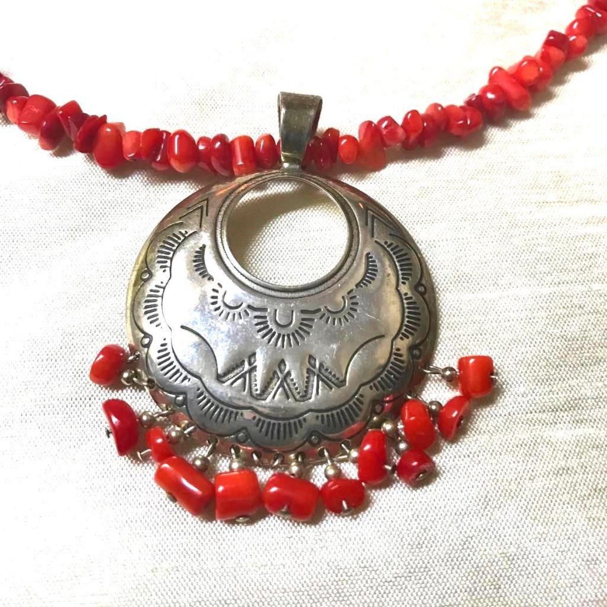Navajo Concha etched sterling silver & coral nugget 18" necklace. Signed QT Quoc ( Carolyn Pollock Quoc ) with sunrise pattern etching.Â