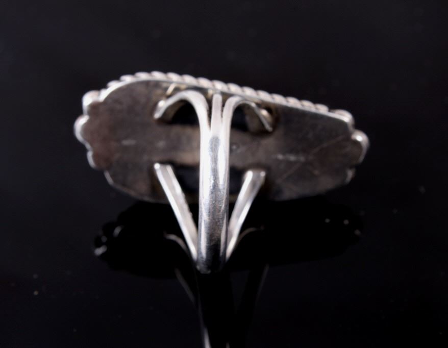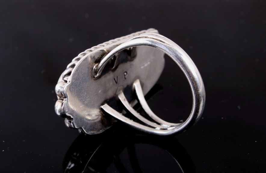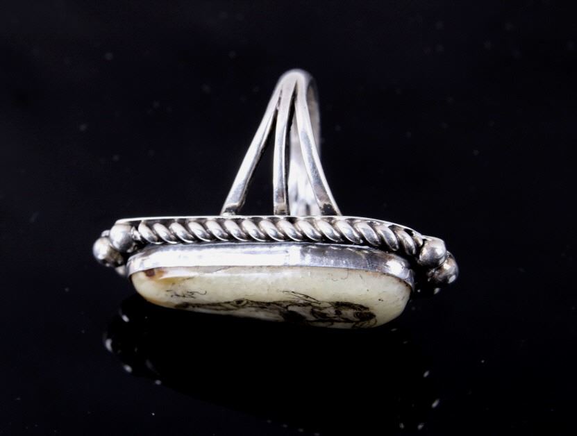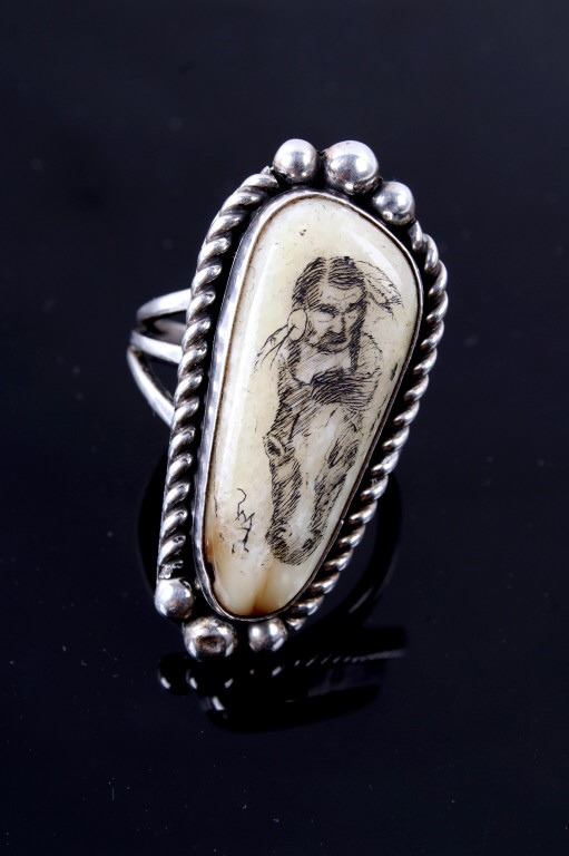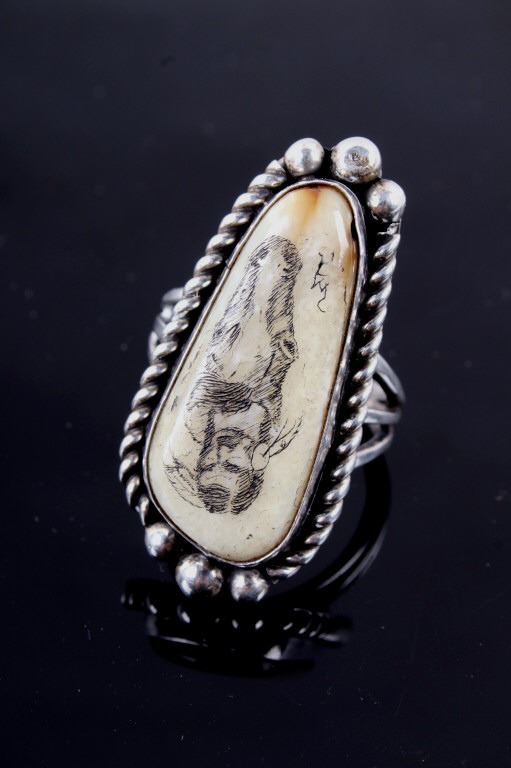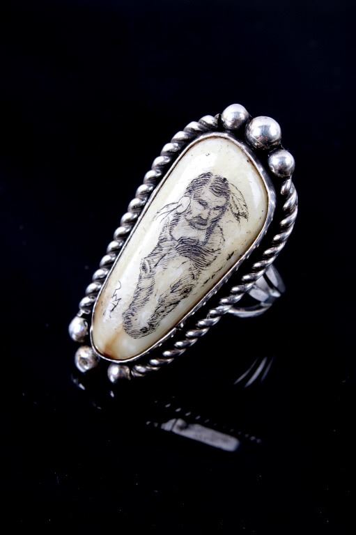 Included in this lot is a signed Navajo Native American scrimshaw agate and sterling silver ring. This agate scrimshaw depicts a Native American warrior on a horse. The attention to detail is phenomenal on this ring. The agate stone is set in a shadow box and accented by braided silver and silver beads. The back of the ring is stamped with the artists hallmark "VP". The ring measures a US size 11 1/4.