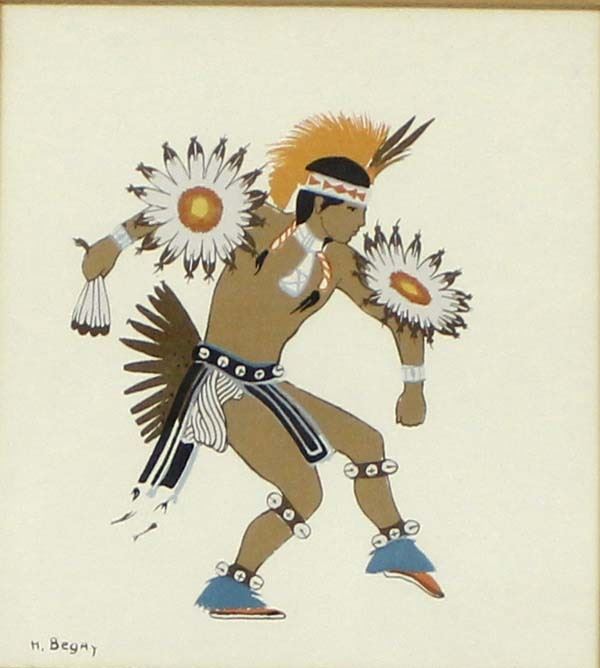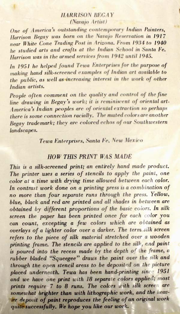 Native American Navajo Silkscreen Print by Harrison Begay (1917 -  2012), framed, matted, under glass.  Visual measures approx. 6x7"