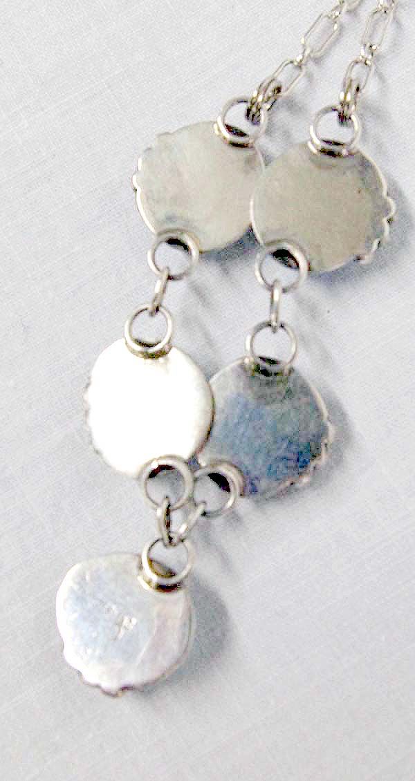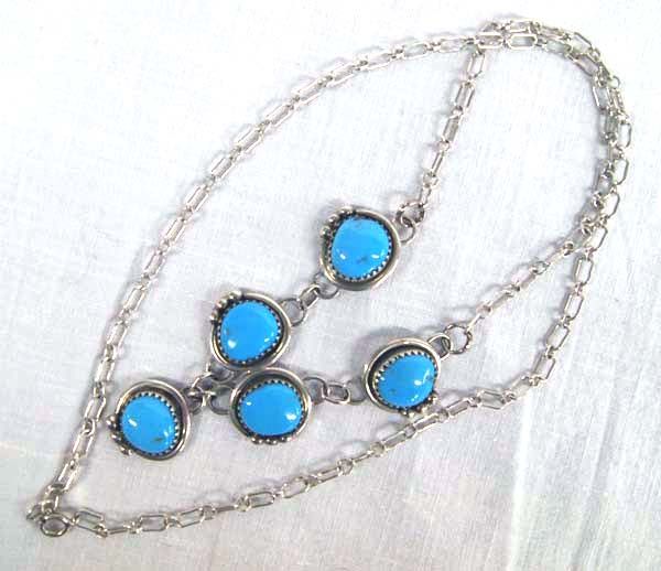 Navajo Sterling Silver Bisbee Blue Turquoise Necklace by Rita Dawes, hallmarked D and stamped sterling, measures 21.75'' end to end, pendant area measures 4''L x .75''W, hand wrought chain, features 5 gorgeous Sawtooth Bezel Set Bisbee Blue Turquoise cabochons measuring .25''D, silver bead accents, 16.2g in total wt.