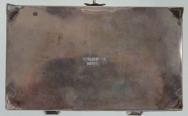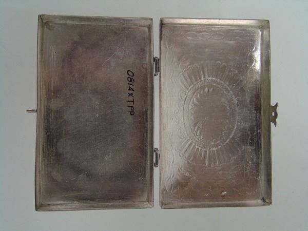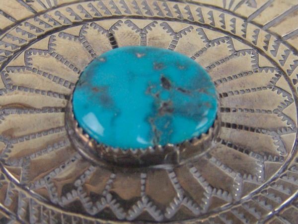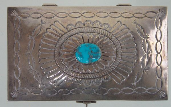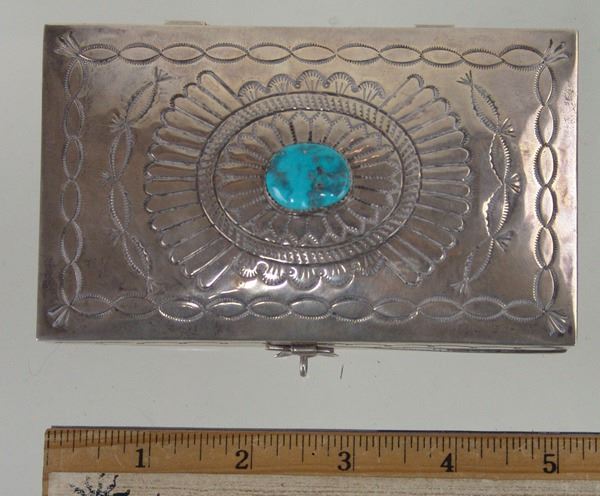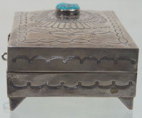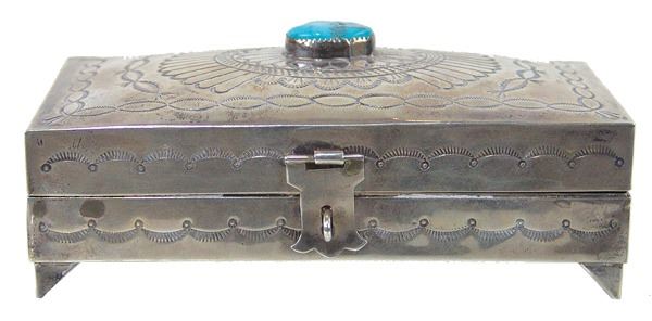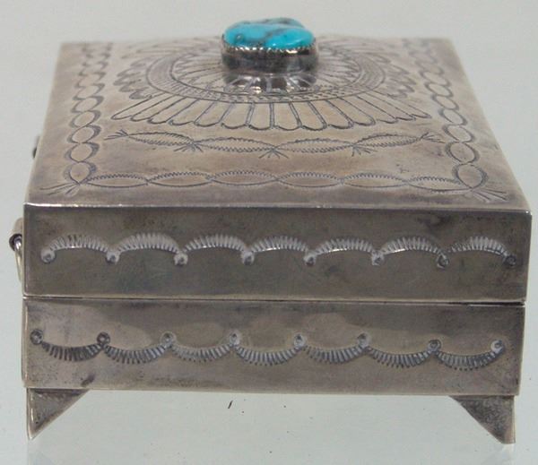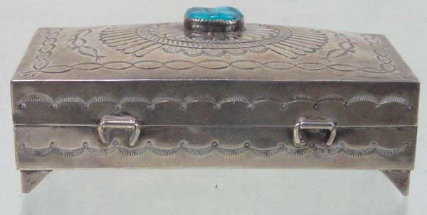 Beautiful, handwrought, all silver box with hinged lid, stamped designs, and single Morenci turquoise stone on top. Susie is the now well know box make, who didn't start until the late 1980s. Very good condition.Late 1900s1-1/2" x 3" x 5"