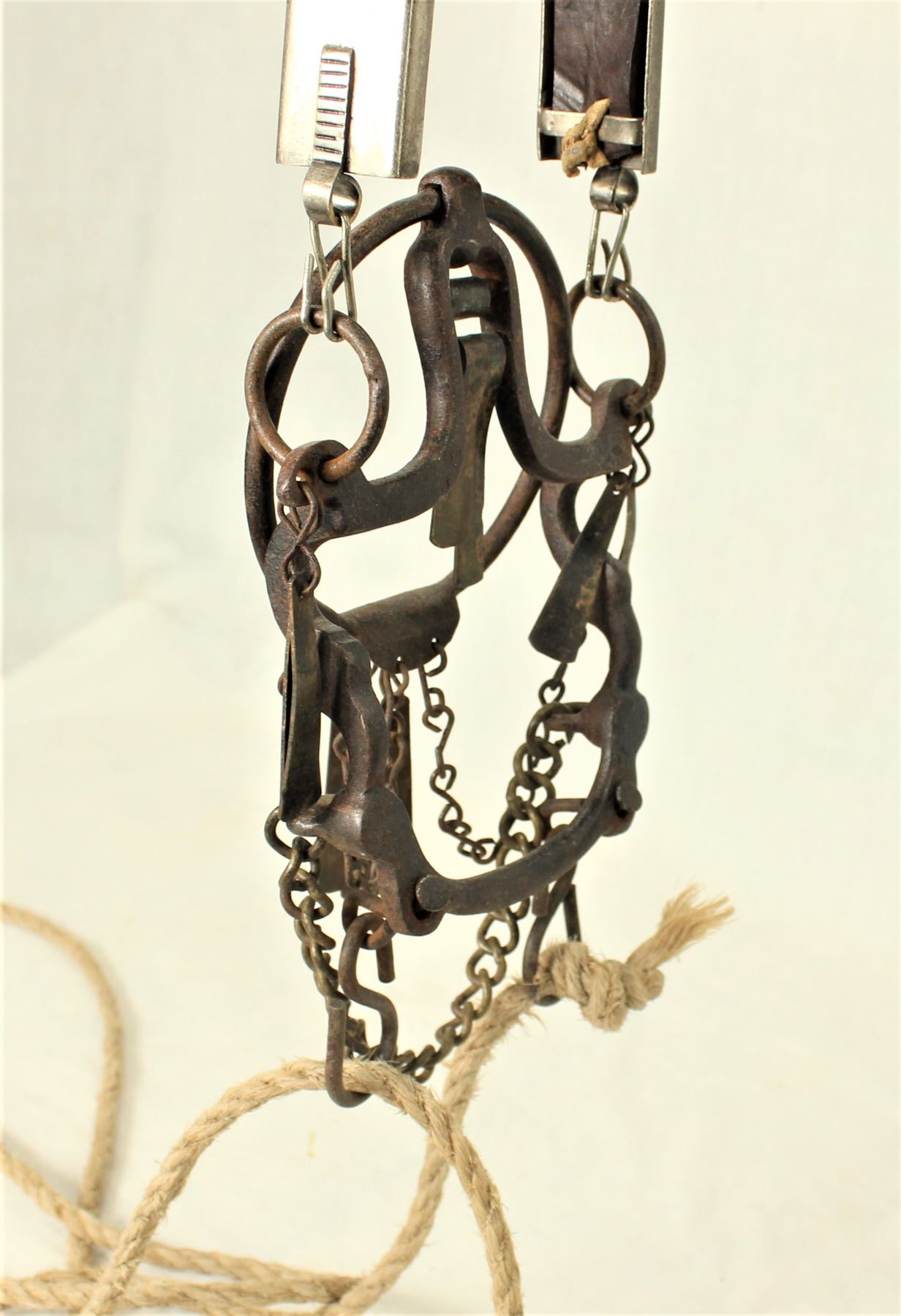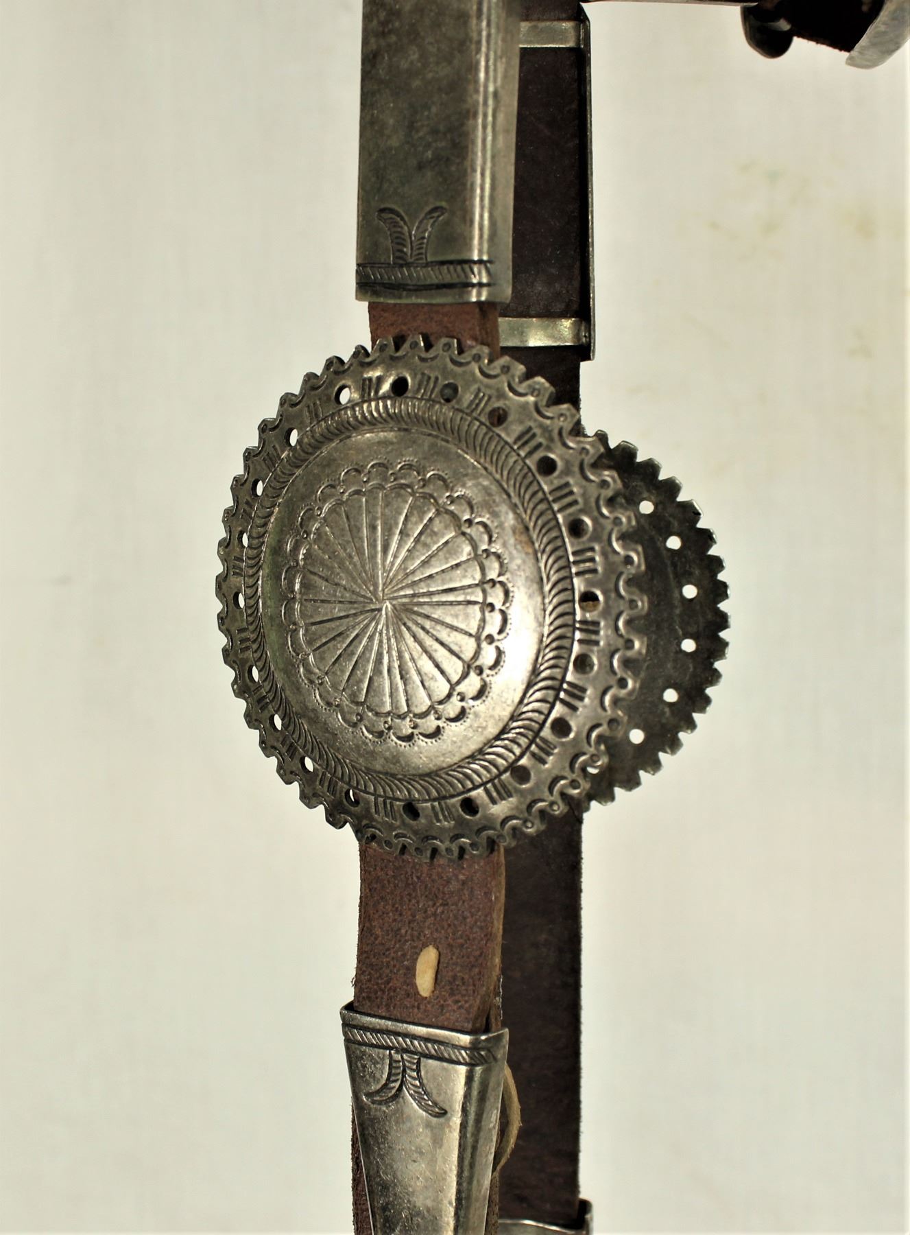 Very showy vintage Navajo silver bridle with large scalloped medallions and massive browband, and completed by an antique iron ring bit. Showing nice eye appeal and condition with silver on newer leather.