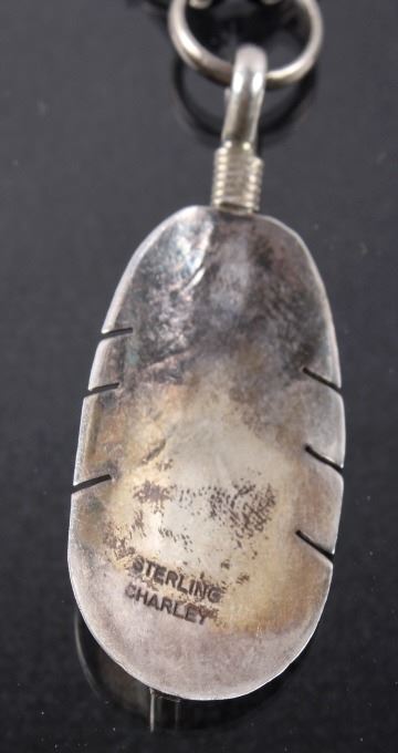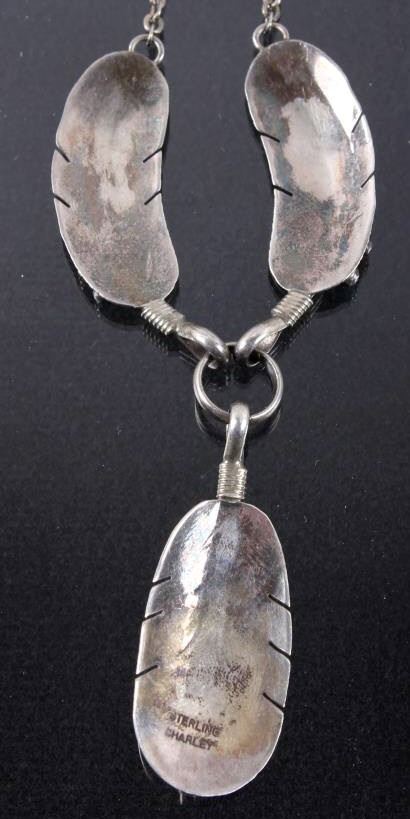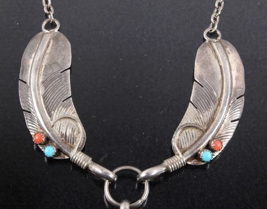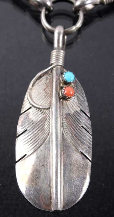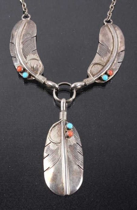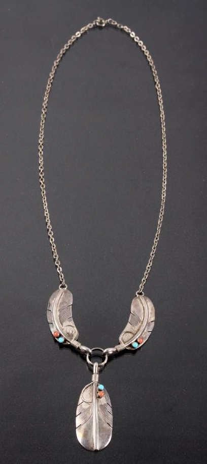 For bidding in this lot is a signed Navajo Native American Indian, sterling silver & multi-stone, drop pendant necklace. The necklace is composed of three sterling silver feather pendants, each adorned with a small nugget of turquoise, and oxblood coral. The feathers drape elegantly off of a Belcher round chain. The bottom feather is stamped on the back; "Sterling", indicating its .925% silver purity. As well, the necklace is marked with the Navajo hallmark "Charlie". The necklace shows warm patina indicative of age, and good condition overall. When unclasped and stretched out, the necklace measures 21 3/4" long. The center pendant alone measures 1 7/8" long, and 3/4" wide.